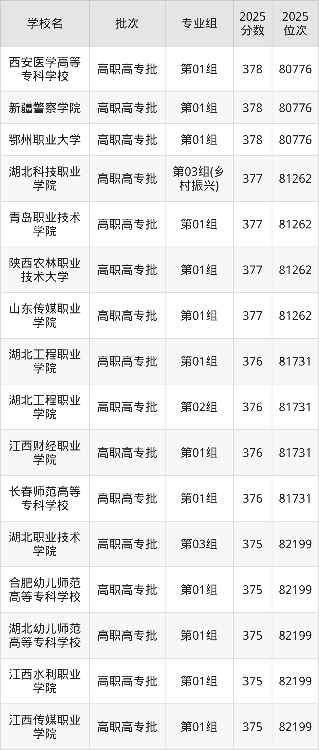 2025年湖北高考历史类376分(81263名~81731名)能上的大学有湖北工程职业学院第01组、湖北工程职业学院第02组、长春师范高等专科学校第01组、江西财经职业学院第01组。