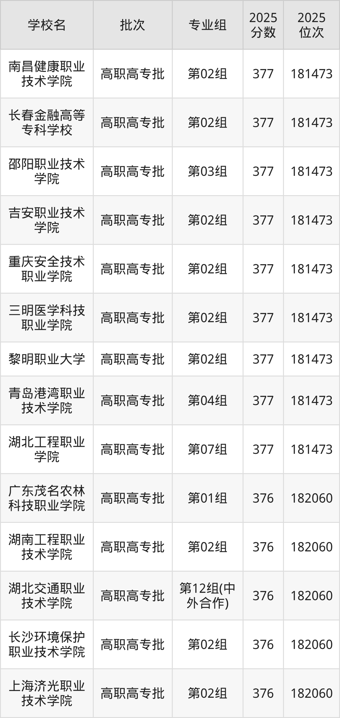 2025年湖北高考物理类376分(181474名~182060名)能上的大学有湖北交通职业技术学院第12组(中外合作)、上海济光职业技术学院第02组、湖南工程职业技术学院第02组、长沙环境保护职业技术学院第02组等。