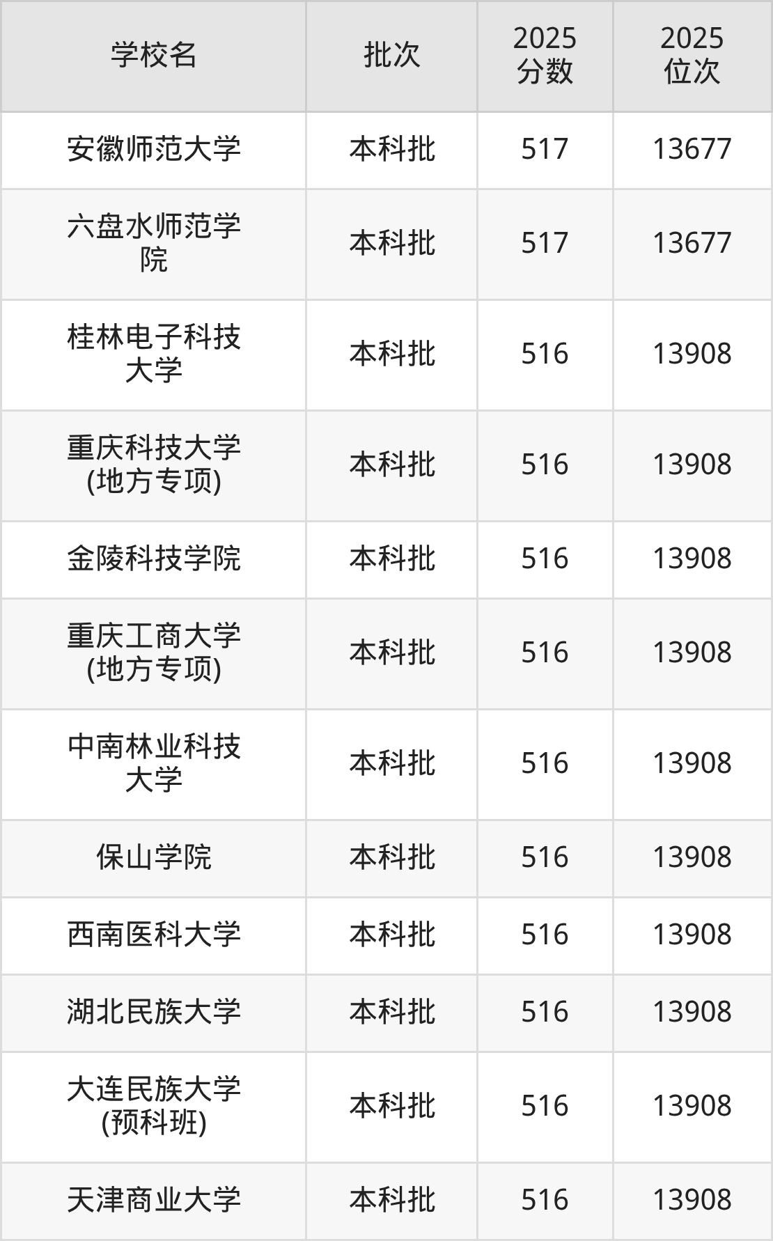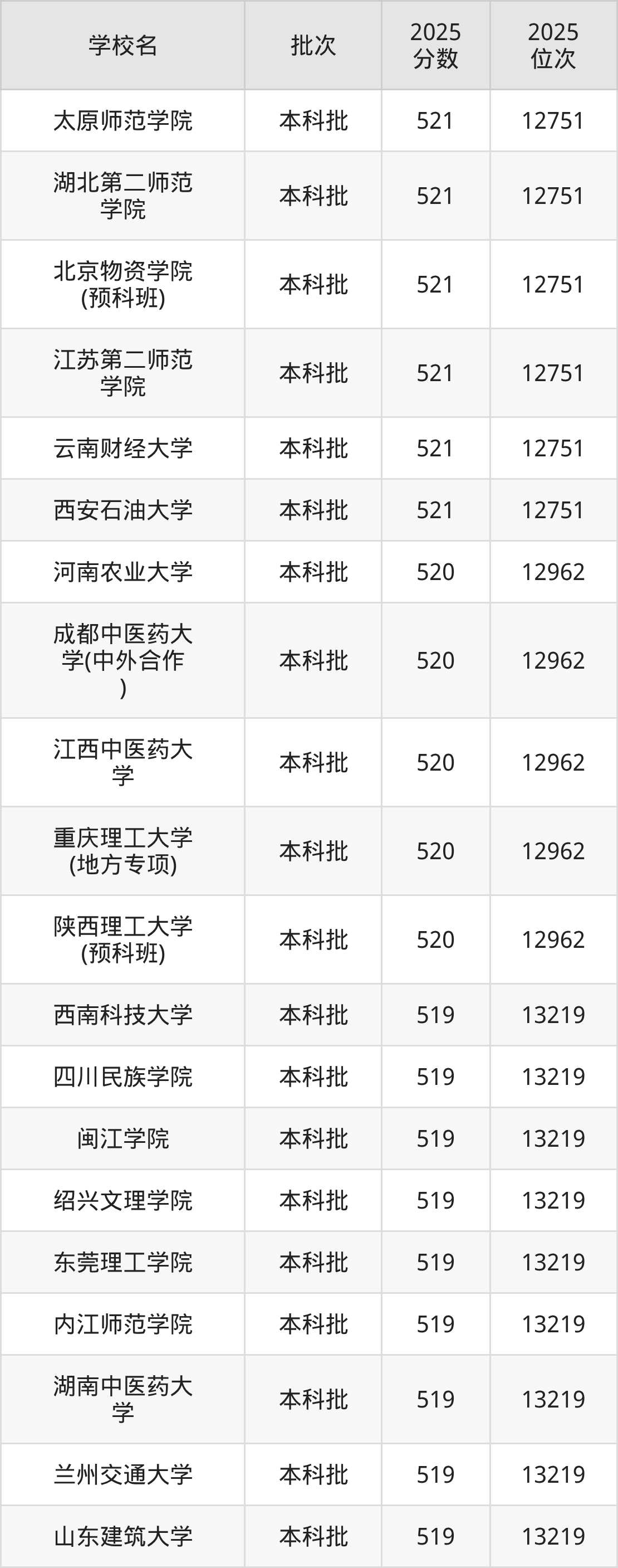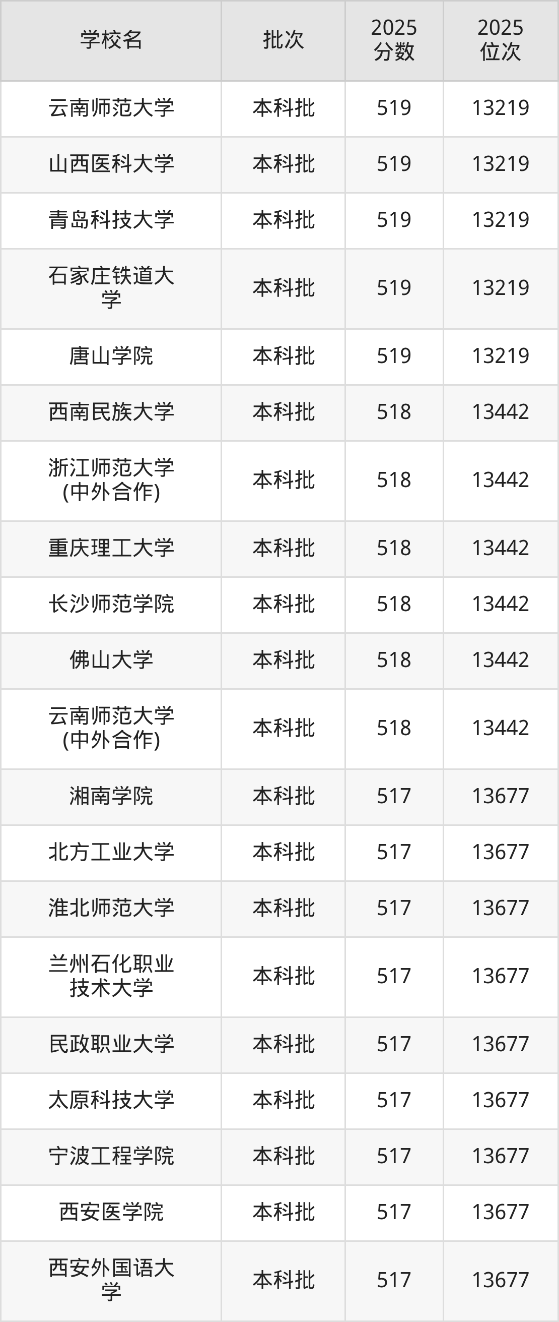 这些都是2026年高考历史类13220名~13442名考生可以报考的大学,更多学校名单如下表所示: