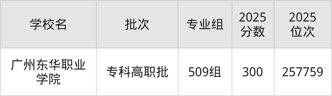 2025年广东高考历史类300分(257277名~257928名)能上的大学有广州东华职业学院509组。