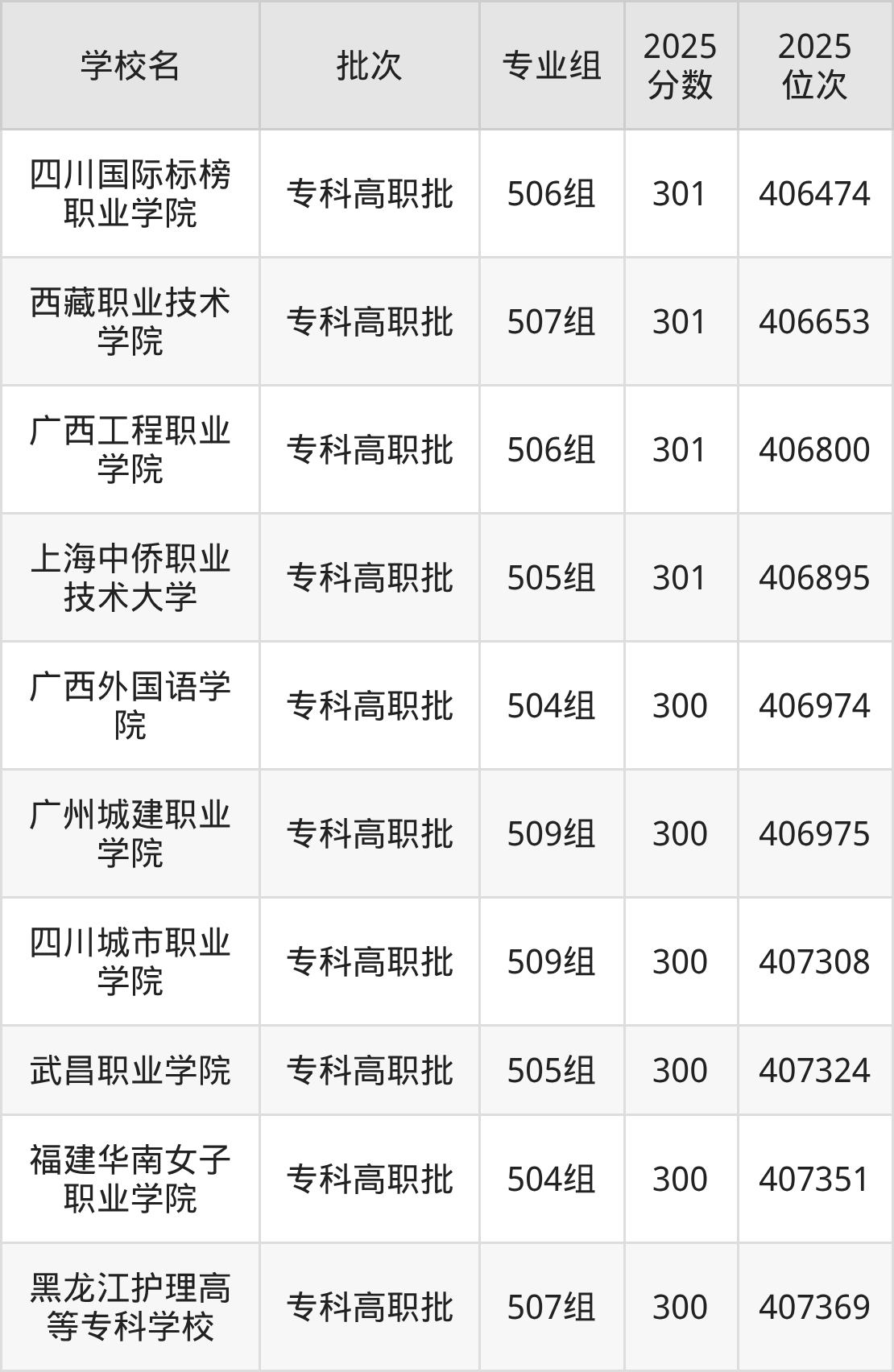 另外录取位次低于该区间(较稳妥)的有武汉外语外事职业学院504组(408480名)、昆明城市学院504组(408641名)等;录取位次高于该区间(可冲)的有上海中侨职业技术大学505组(406895名)、广西工程职业学院506组(406800名)等。
