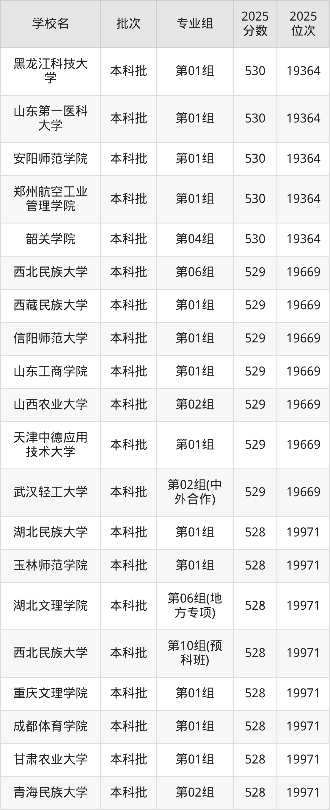 2025年湖北高考历史类529分(19365名~19669名)能上的大学有西北民族大学第06组、武汉轻工大学第02组(中外合作)、天津中德应用技术大学第01组、山西农业大学第02组等。