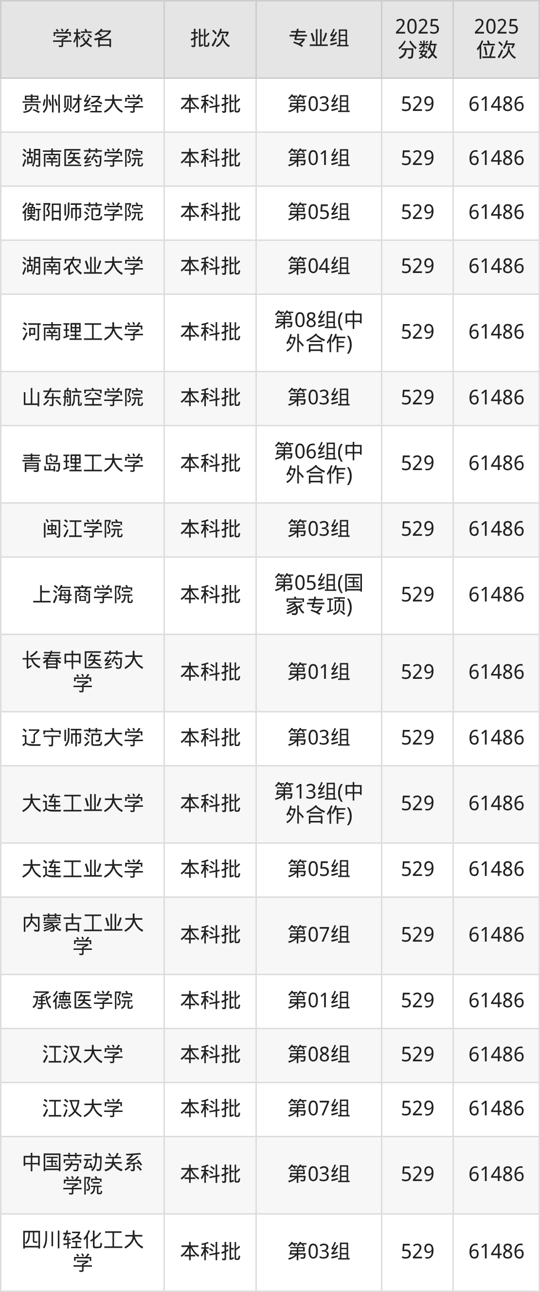 2025年湖北高考物理类529分(60630名~61486名)能上的大学有中国劳动关系学院第03组、江汉大学第07组、江汉大学第08组、承德医学院第01组等。