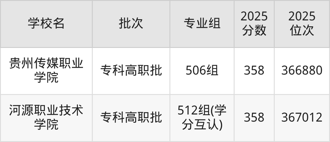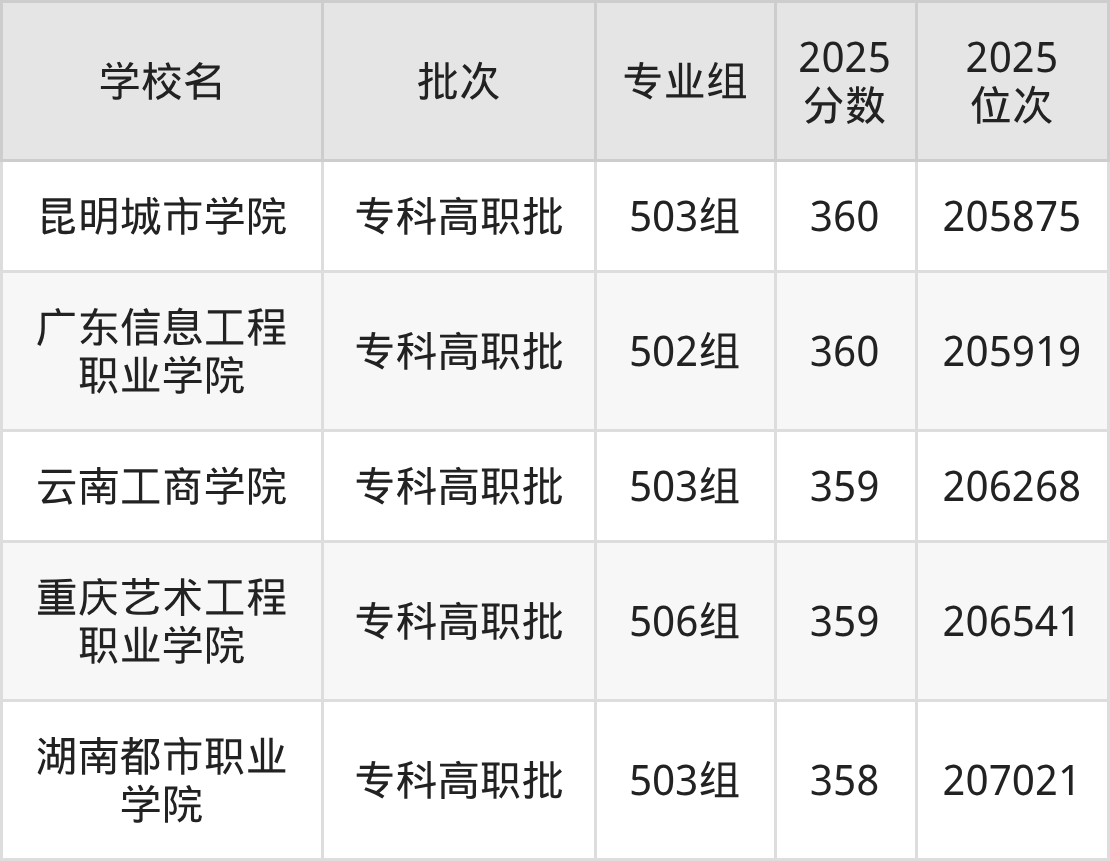 2025年广东高考历史类359分(205917名~206952名)能上的大学有云南工商学院503组、重庆艺术工程职业学院506组。