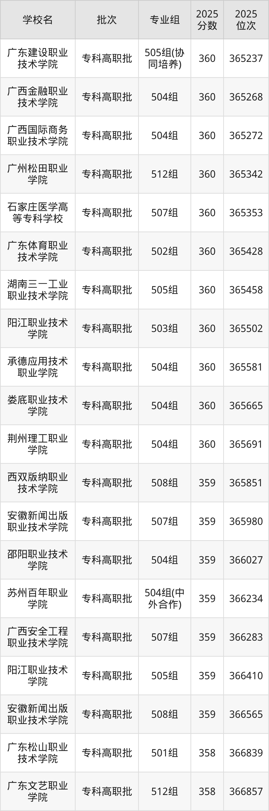 2025年广东高考物理类359分(365723名~366562名)能上的大学有邵阳职业技术学院504组、阳江职业技术学院505组、西双版纳职业技术学院508组、安徽新闻出版职业技术学院507组等。