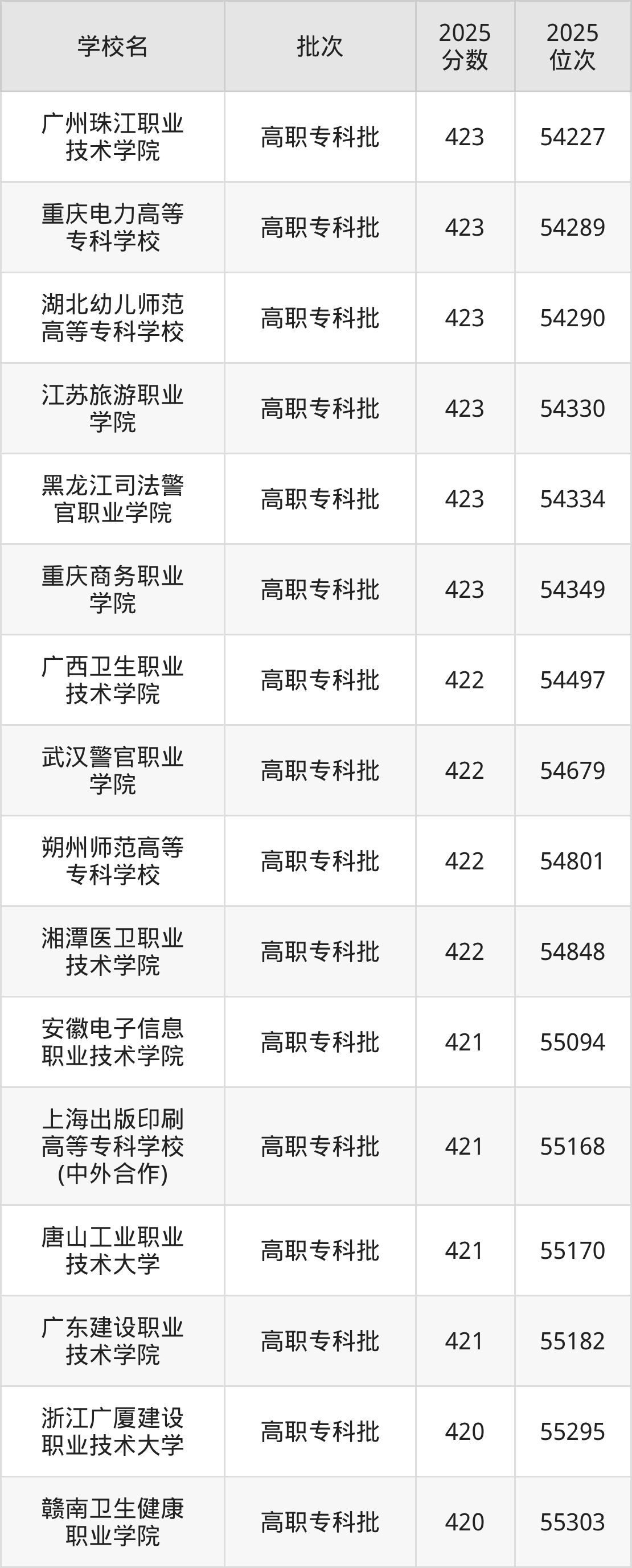 2025年贵州高考历史类422分(54485名~54903名)能上的大学有武汉警官职业学院、广西卫生职业技术学院、朔州师范高等专科学校、湘潭医卫职业技术学院。