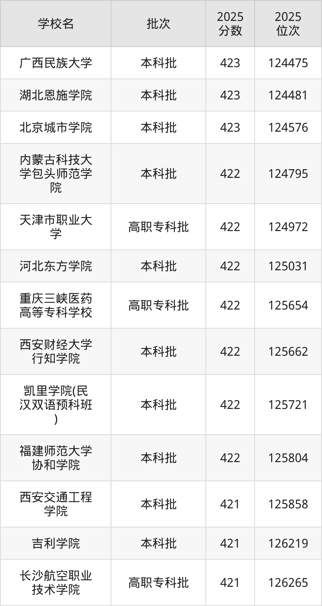 这些都是2026年高考物理类124736名~125806名考生可以报考的大学,更多学校名单如下表所示: