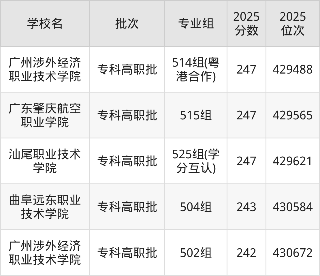 另外录取位次低于该区间(较稳妥)的有广东肇庆航空职业学院501组(283478名)、广东肇庆航空职业学院506组(283717名)等;录取位次高于该区间(可冲)的有广州涉外经济职业技术学院513组(粤港合作)(279217名)、广东文理职业学院508组(学分互认)(277008名)等。