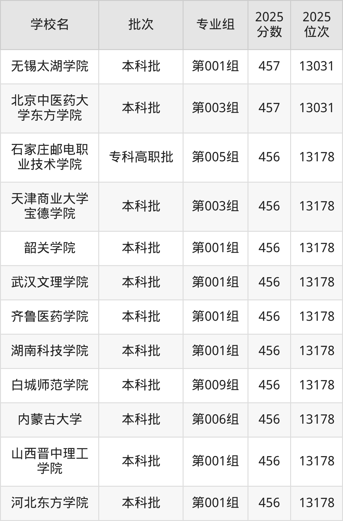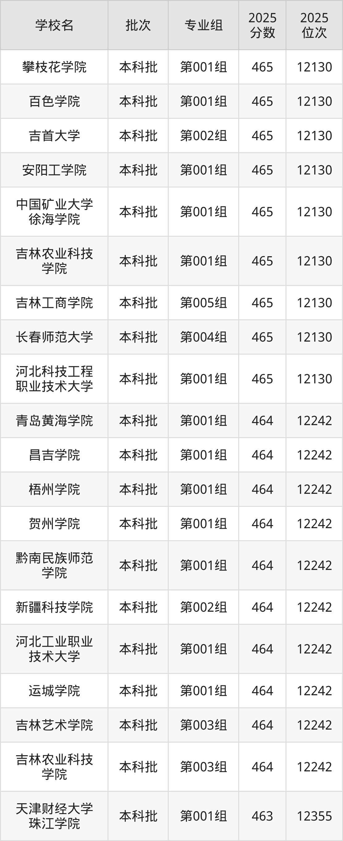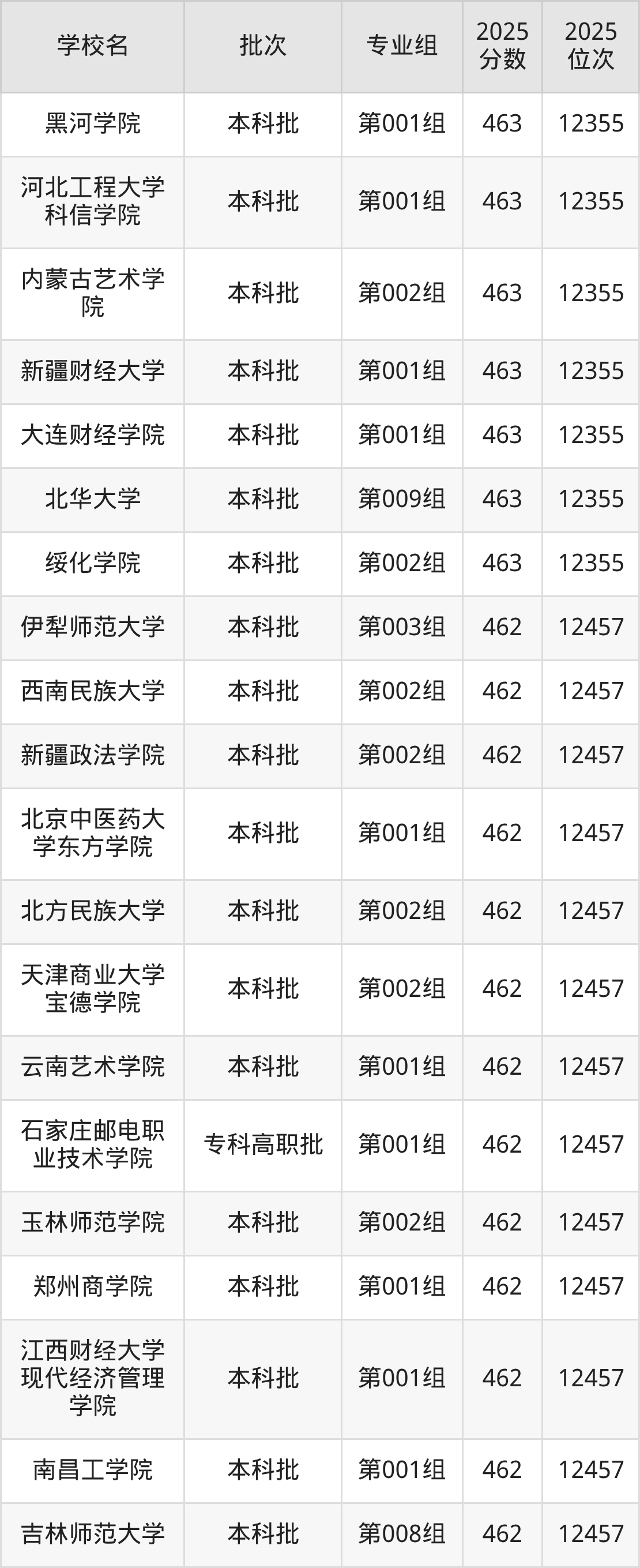 2025年吉林高考历史类460分(12569名~12678名)能上的大学有天津商业大学宝德学院第001组、天津理工大学中环信息学院第001组、河北工程大学第002组、大庆师范学院第002组等。
