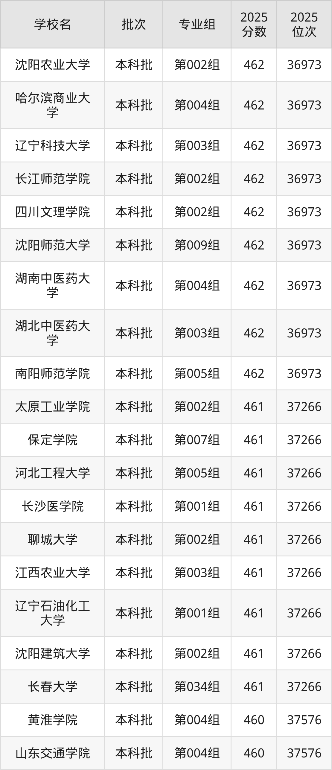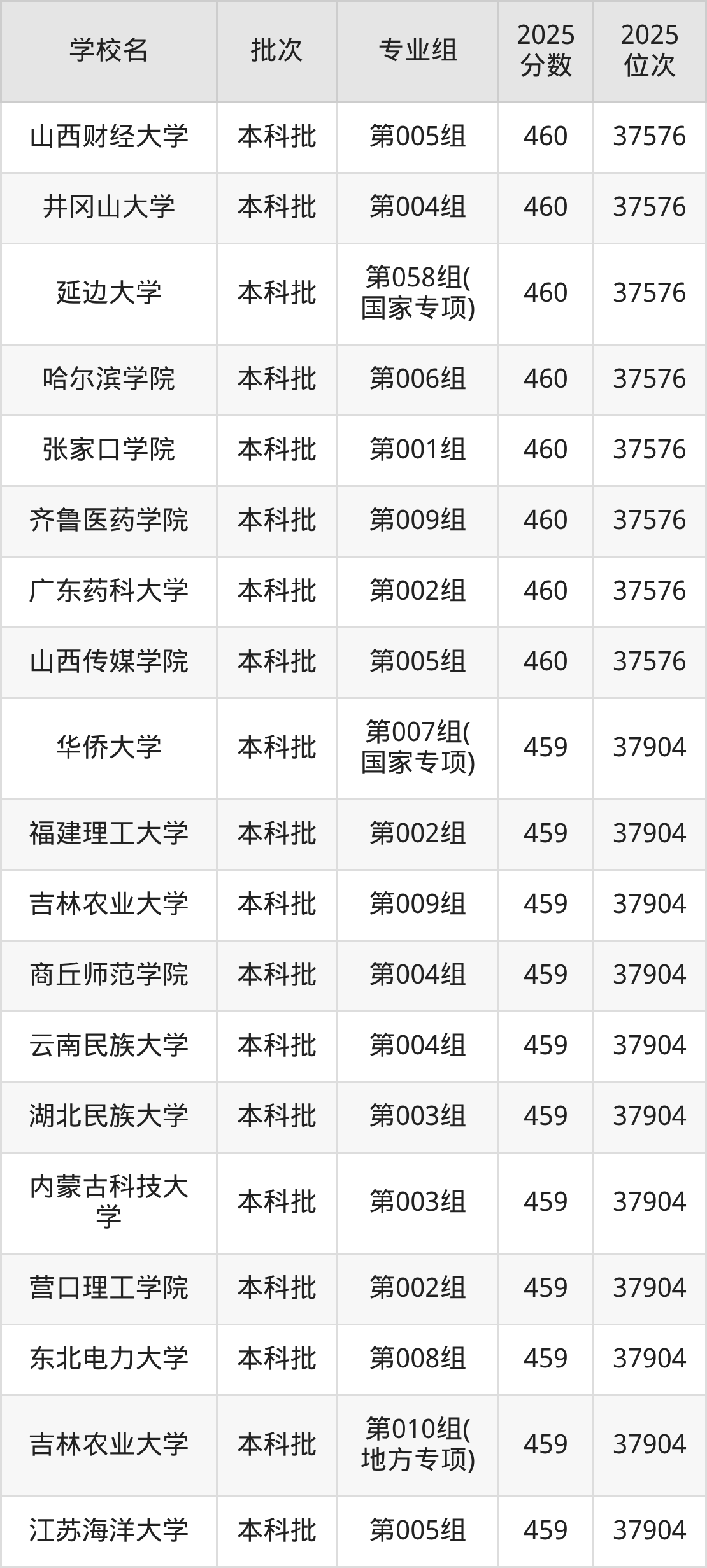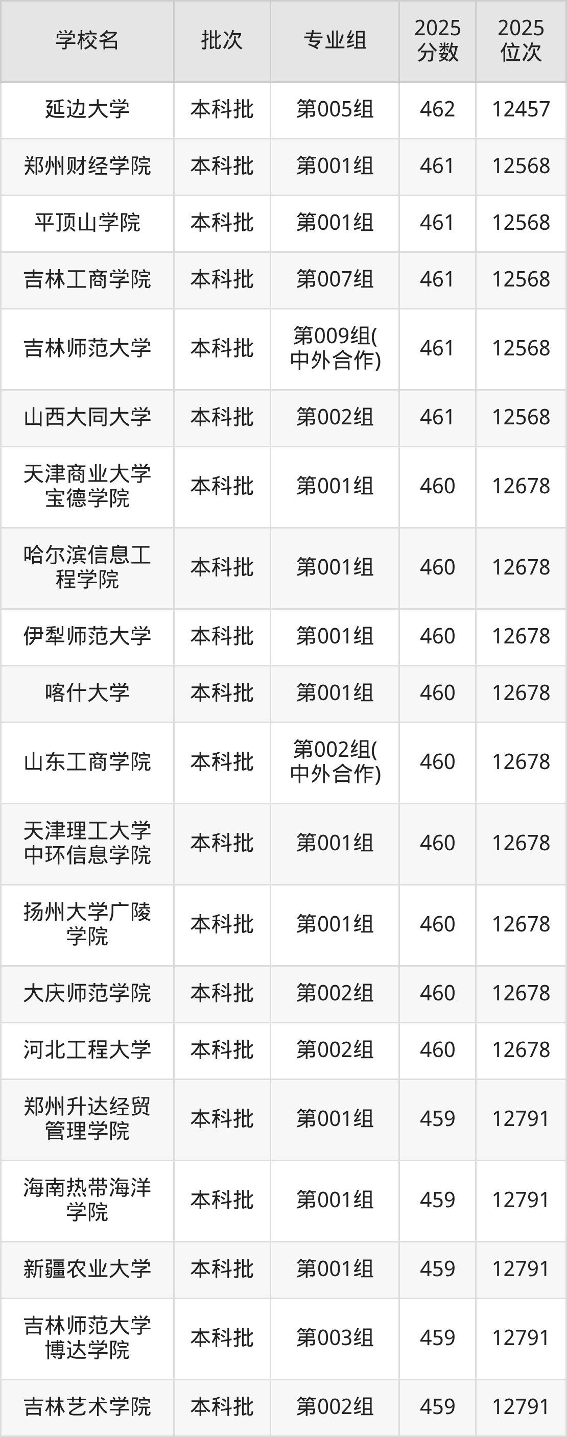 2025年吉林高考物理类460分(37267名~37576名)能上的大学有张家口学院第001组、山西财经大学第005组、山西传媒学院第005组、延边大学第058组(国家专项)等。
