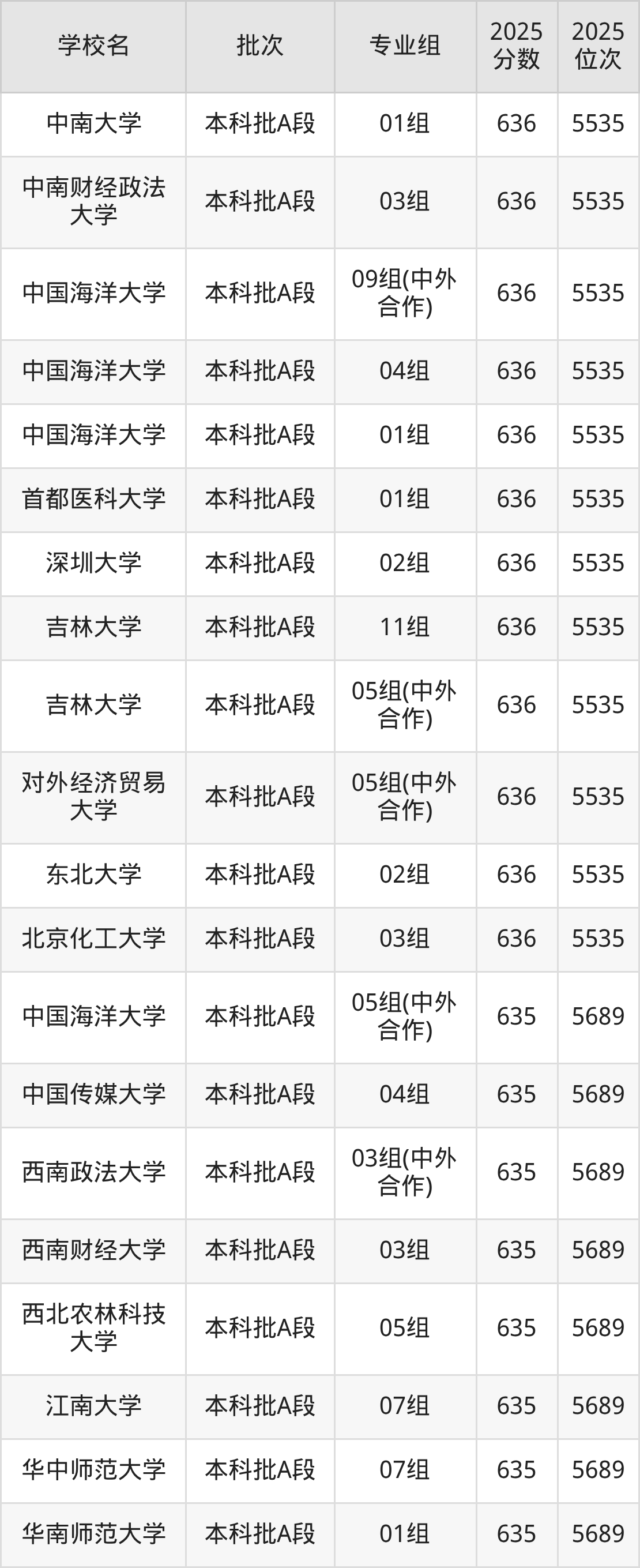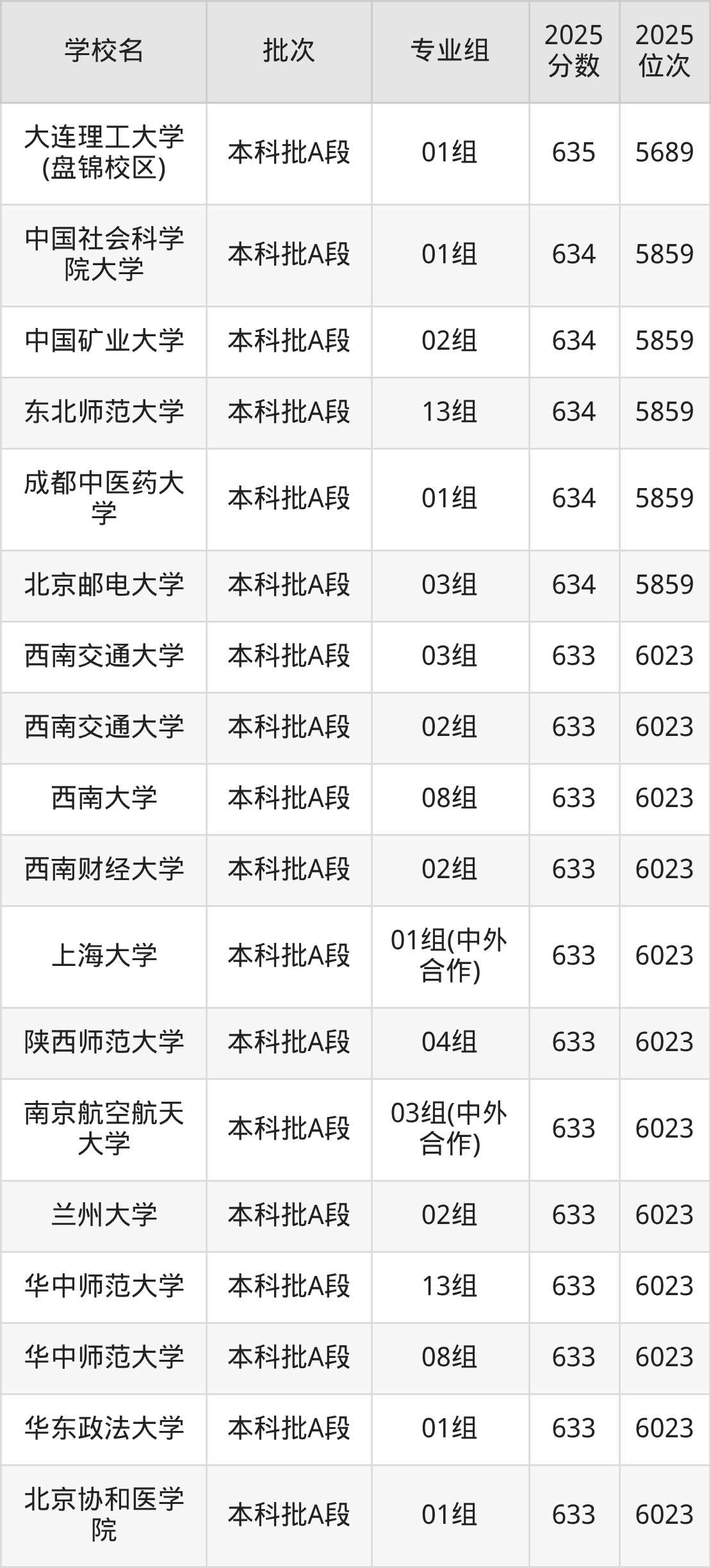 2025年天津高考635分(5536名~5689名)能上的大学有大连理工大学(盘锦校区)01组、华南师范大学01组、华中师范大学07组、江南大学07组等。