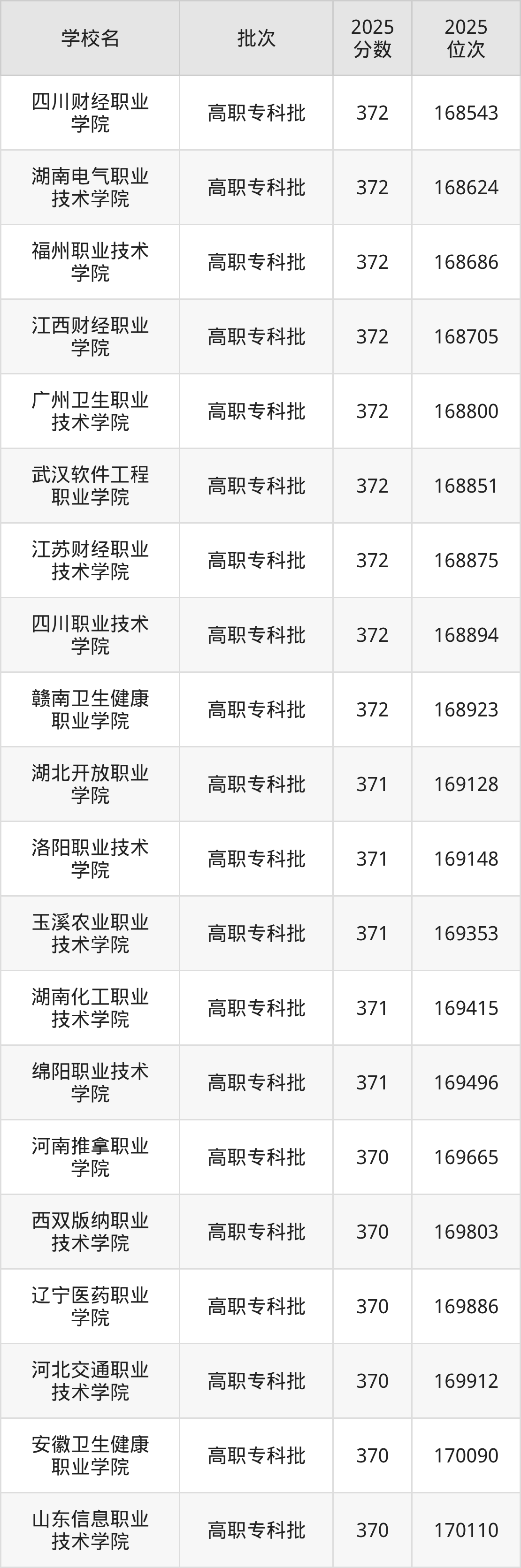 另外录取位次低于该区间(较稳妥)的有河南推拿职业学院(169665名)、西双版纳职业技术学院(169803名)等;录取位次高于该区间(可冲)的有赣南卫生健康职业学院(168923名)、四川职业技术学院(168894名)等。