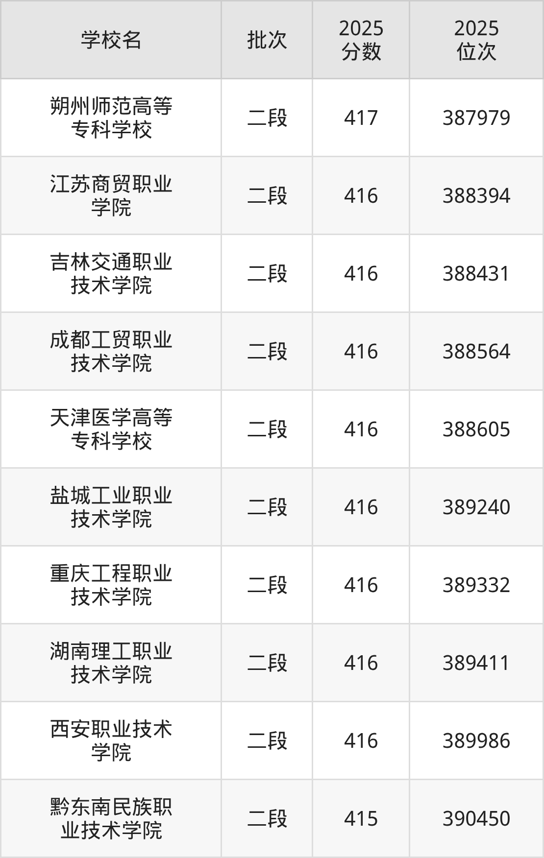 2025年山东高考416分(388100名~390265名)能上的大学有西安职业技术学院、吉林交通职业技术学院、盐城工业职业技术学院、湖南理工职业技术学院等。
