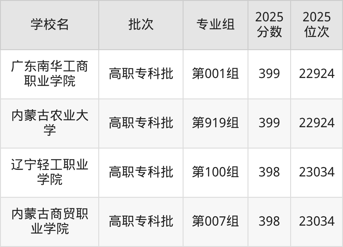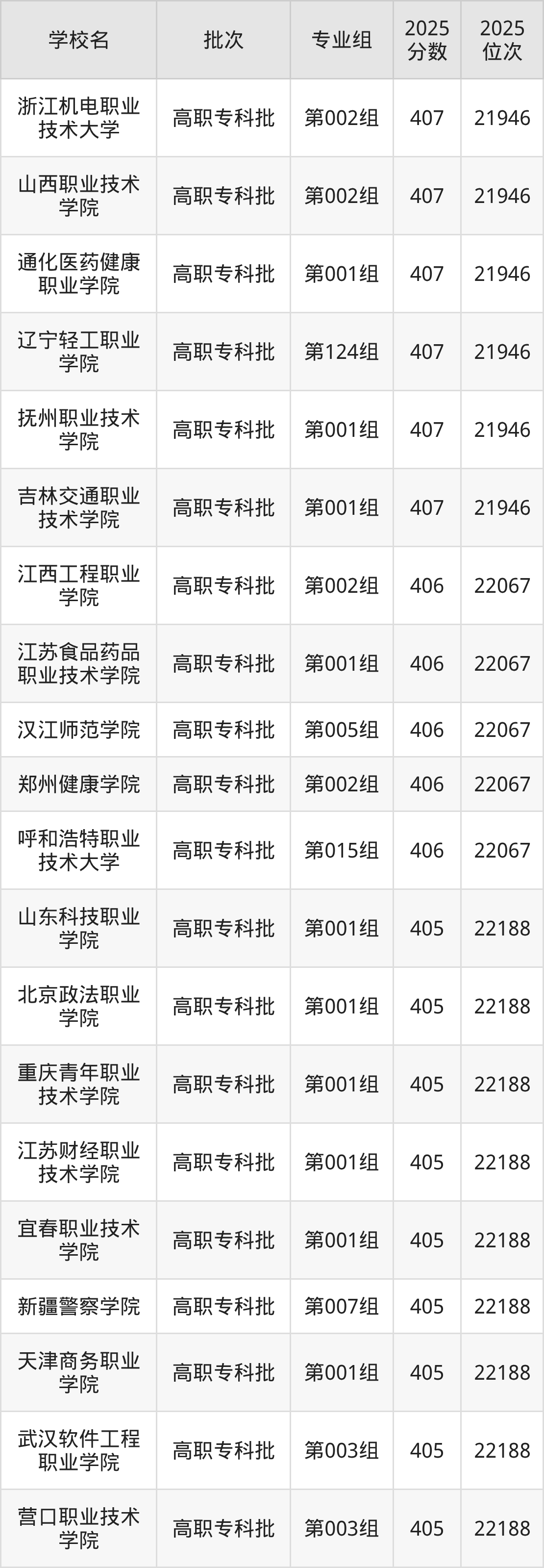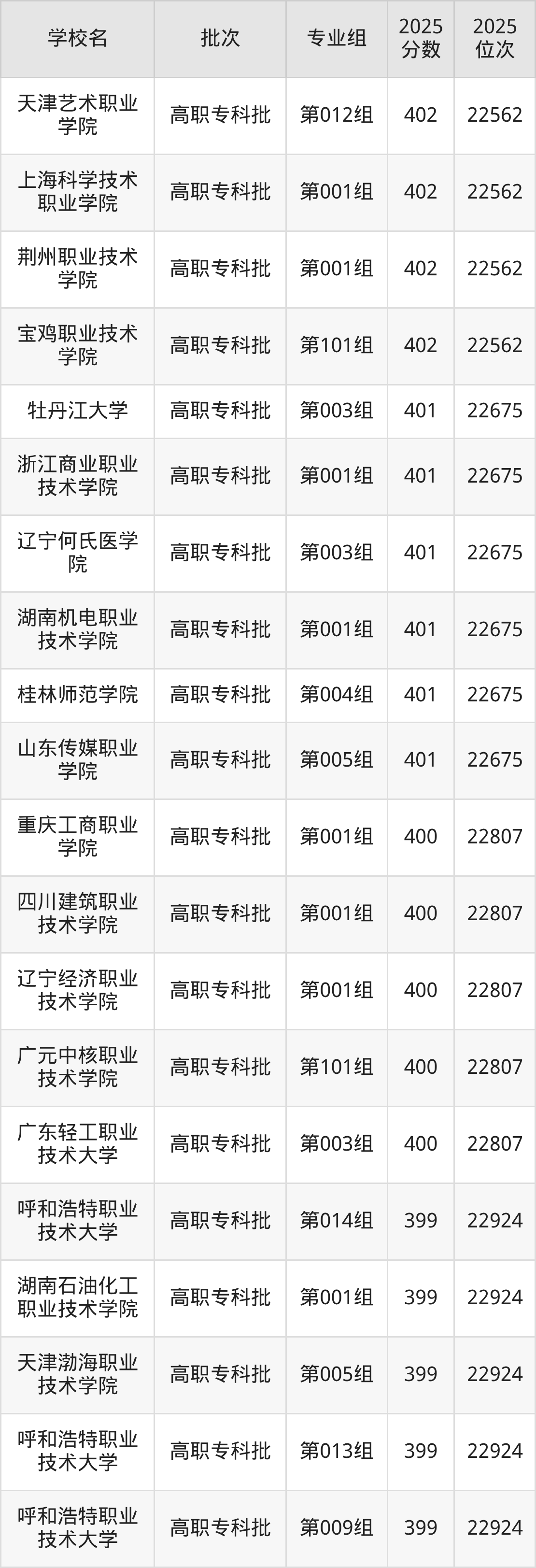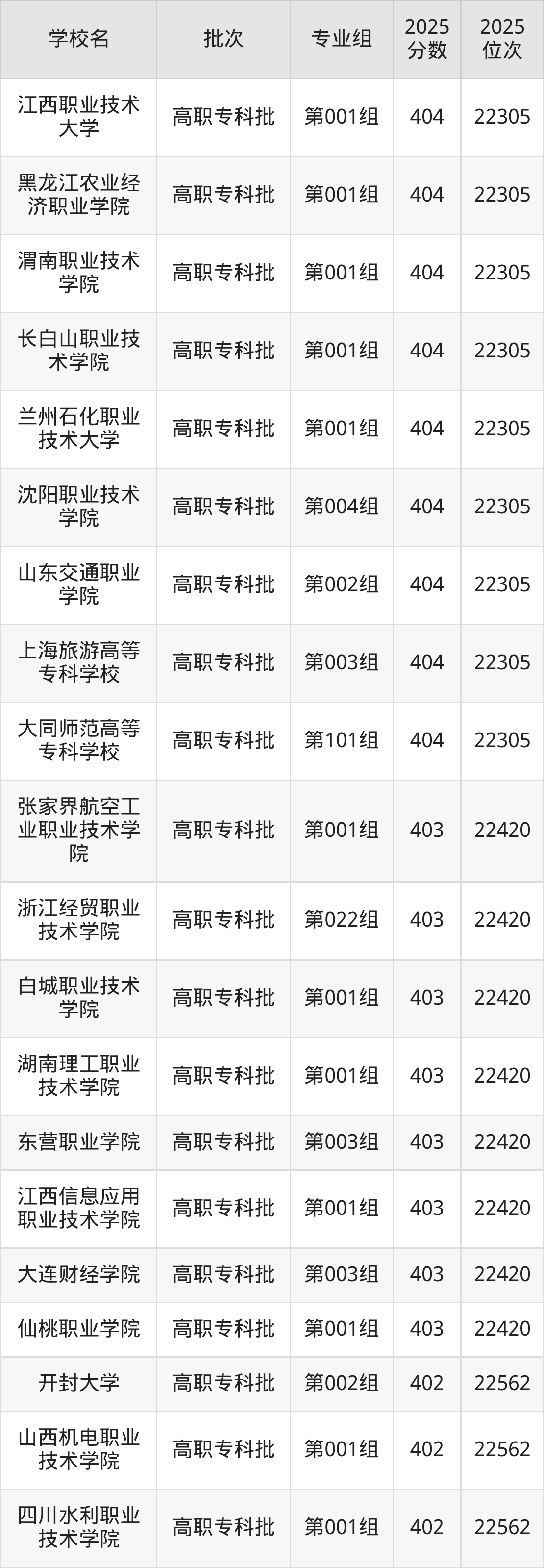 2025年内蒙古高考历史类402分(22421名~22562名)能上的大学有四川水利职业技术学院第001组、荆州职业技术学院第001组、上海科学技术职业学院第001组、宝鸡职业技术学院第101组等。