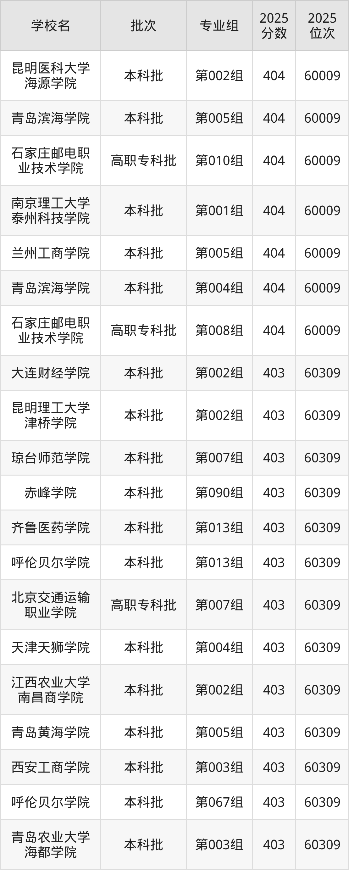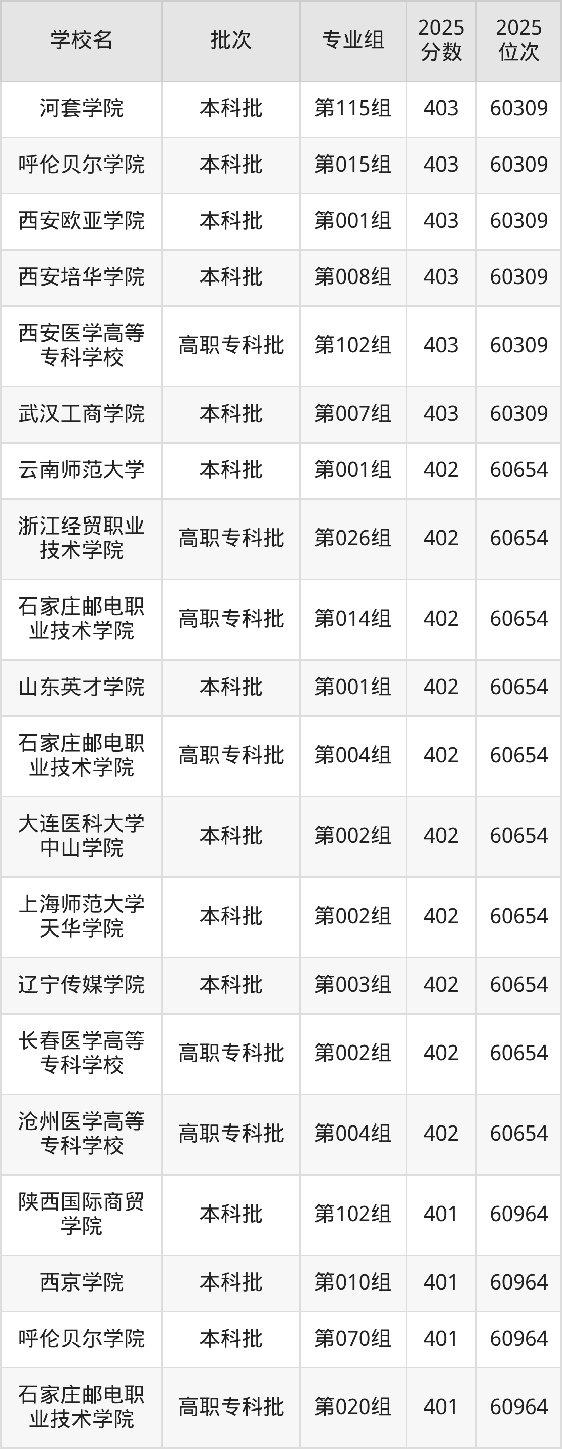 2025年内蒙古高考物理类402分(60310名~60654名)能上的大学有大连医科大学中山学院第002组、云南师范大学第001组、沧州医学高等专科学校第004组、长春医学高等专科学校第002组等。