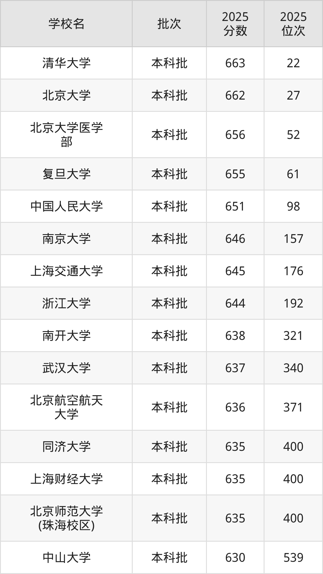 2025年辽宁高考历史类659分(31名~40名)录取位次低于该区间(较稳妥)的有北京大学医学部(52名)、复旦大学(61名)等;录取位次高于该区间(可冲)的有北京大学(27名)、清华大学(22名)。