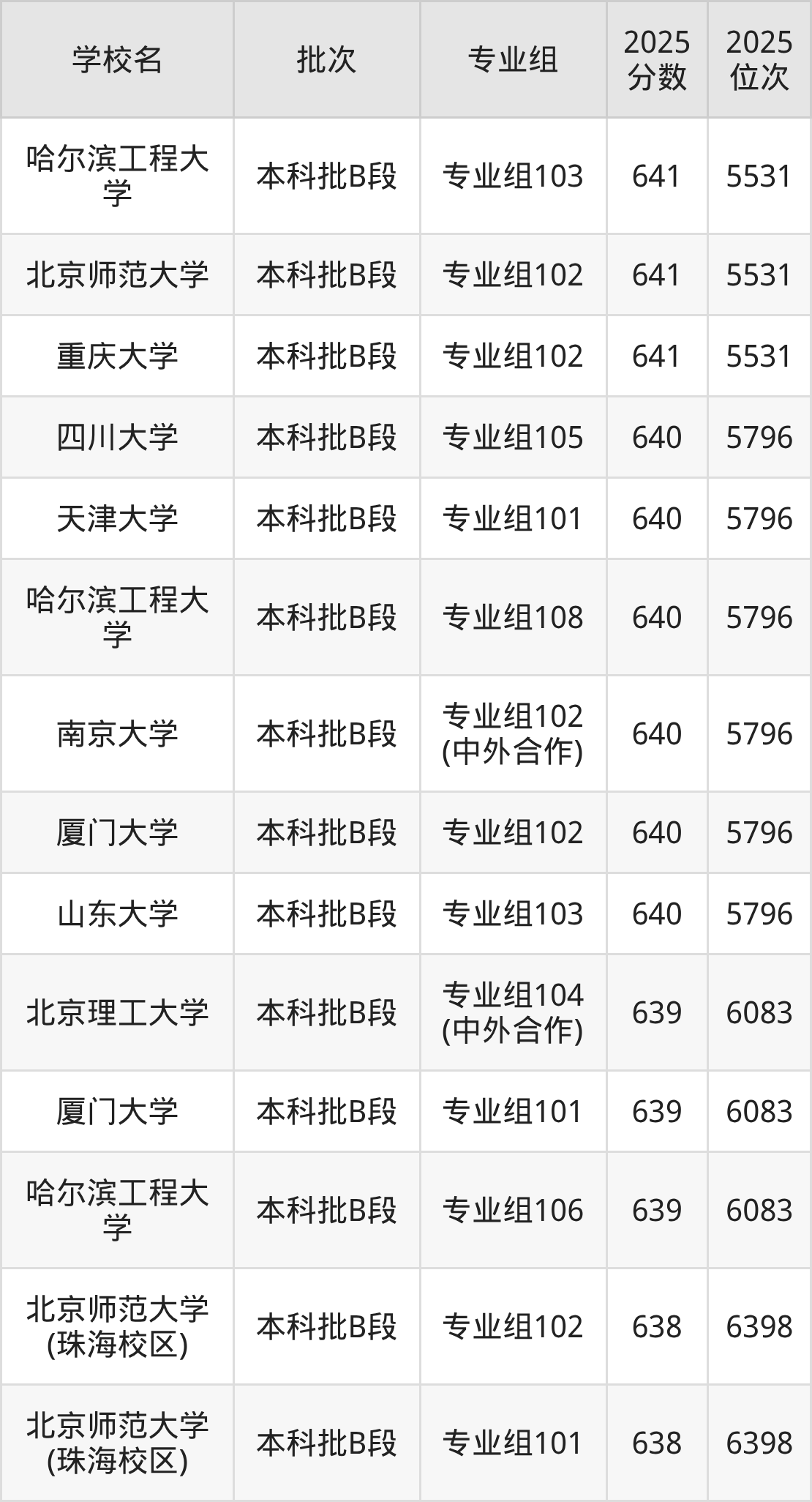 另外录取位次低于该区间(较稳妥)的有北京师范大学(珠海校区)专业组102(6398名)、北京师范大学(珠海校区)专业组101(6398名)等;录取位次高于该区间(可冲)的有天津大学专业组101(5796名)、哈尔滨工程大学专业组108(5796名)等。