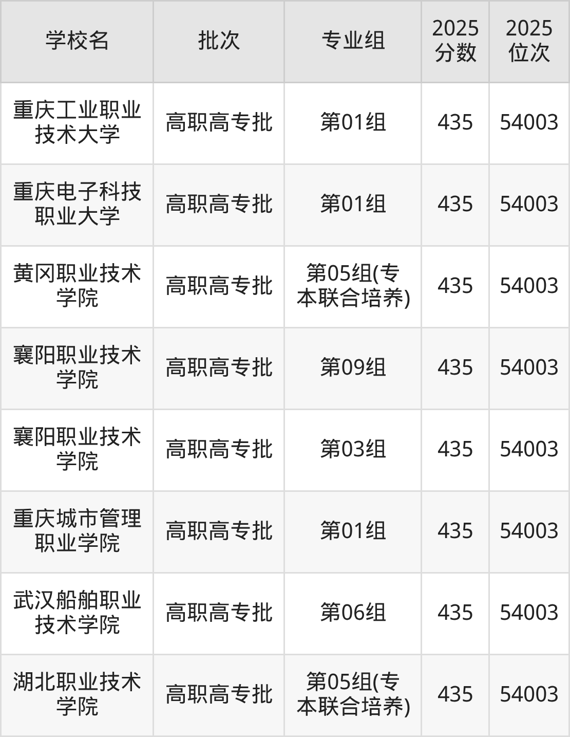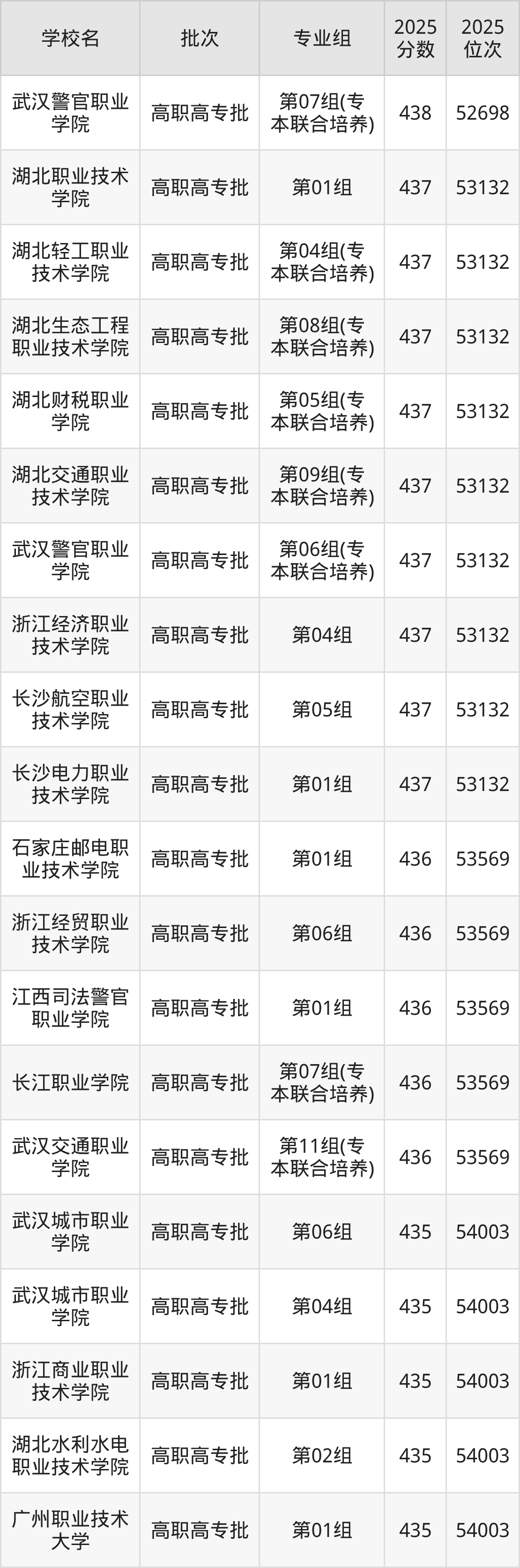 2025年湖北高考历史类436分(53133名~53569名)能上的大学有长江职业学院第07组(专本联合培养)、武汉交通职业学院第11组(专本联合培养)、石家庄邮电职业技术学院第01组、浙江经贸职业技术学院第06组等。