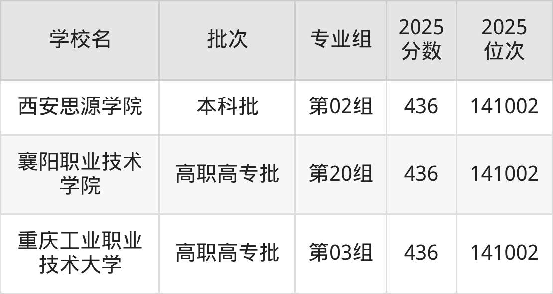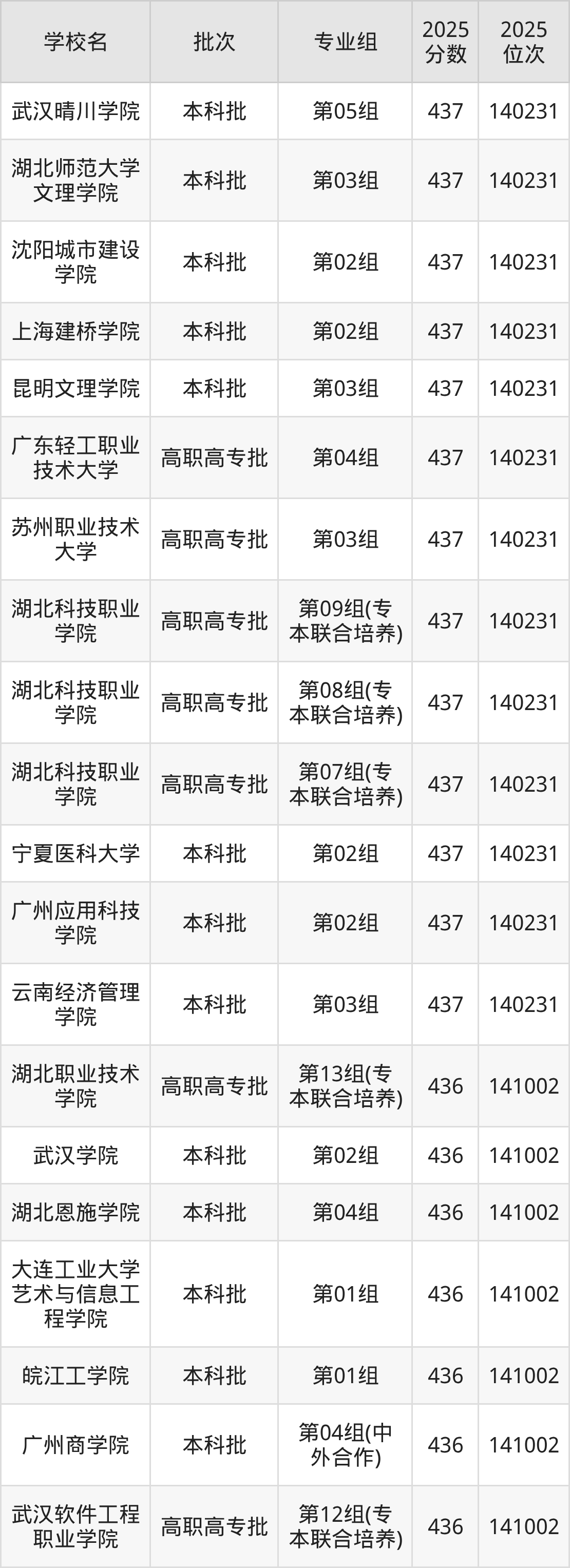 2025年湖北高考物理类436分(140232名~141002名)能上的大学有武汉学院第02组、湖北恩施学院第04组、大连工业大学艺术与信息工程学院第01组、皖江工学院第01组等。