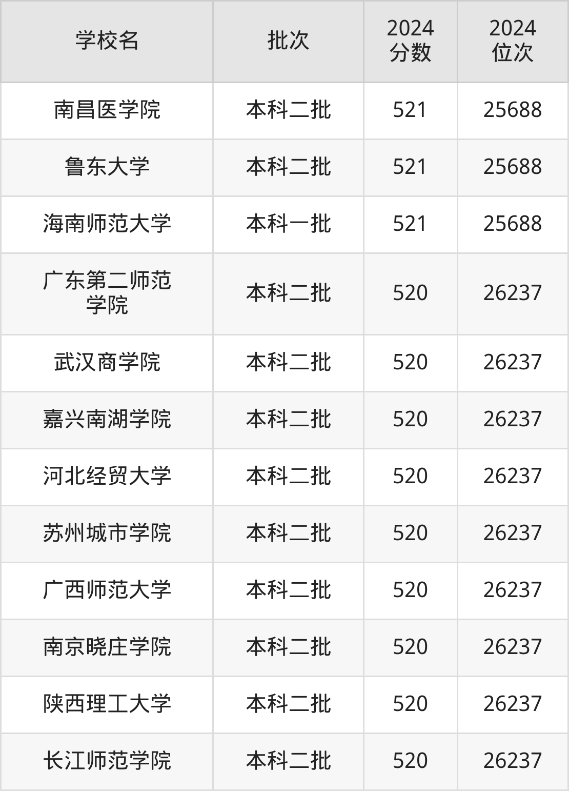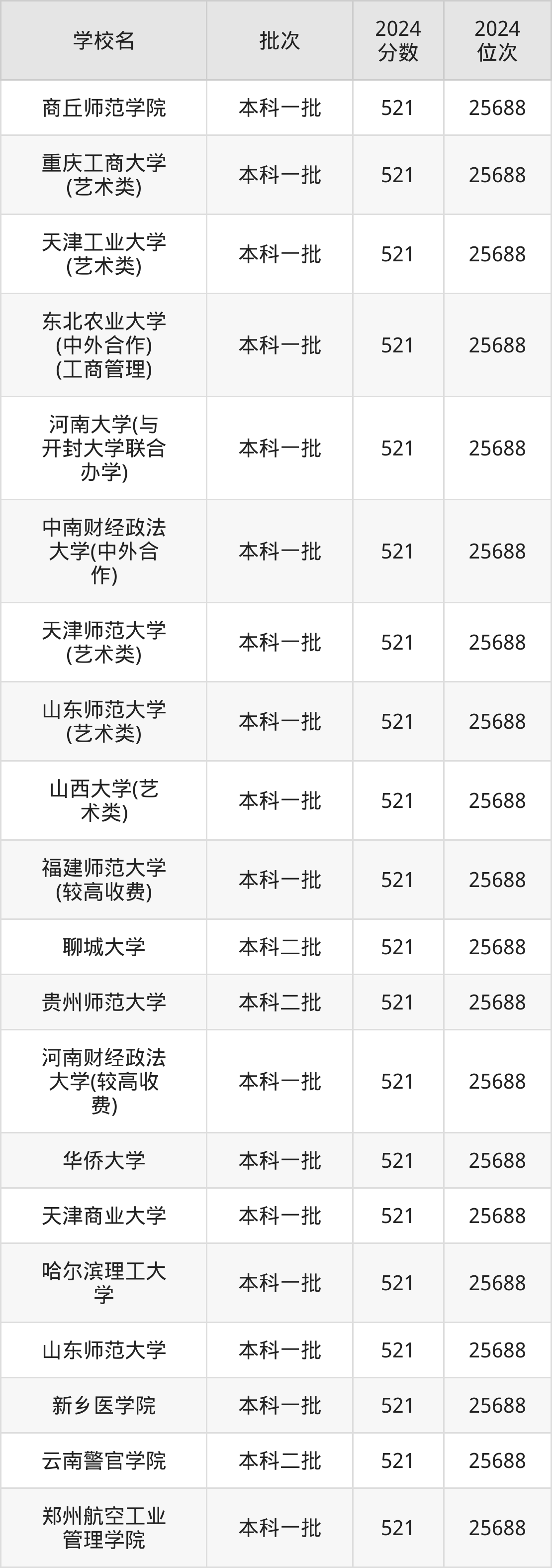 这些都是2025年高考文科25689名~26237名考生可以报考的大学,更多学校名单如下表所示: