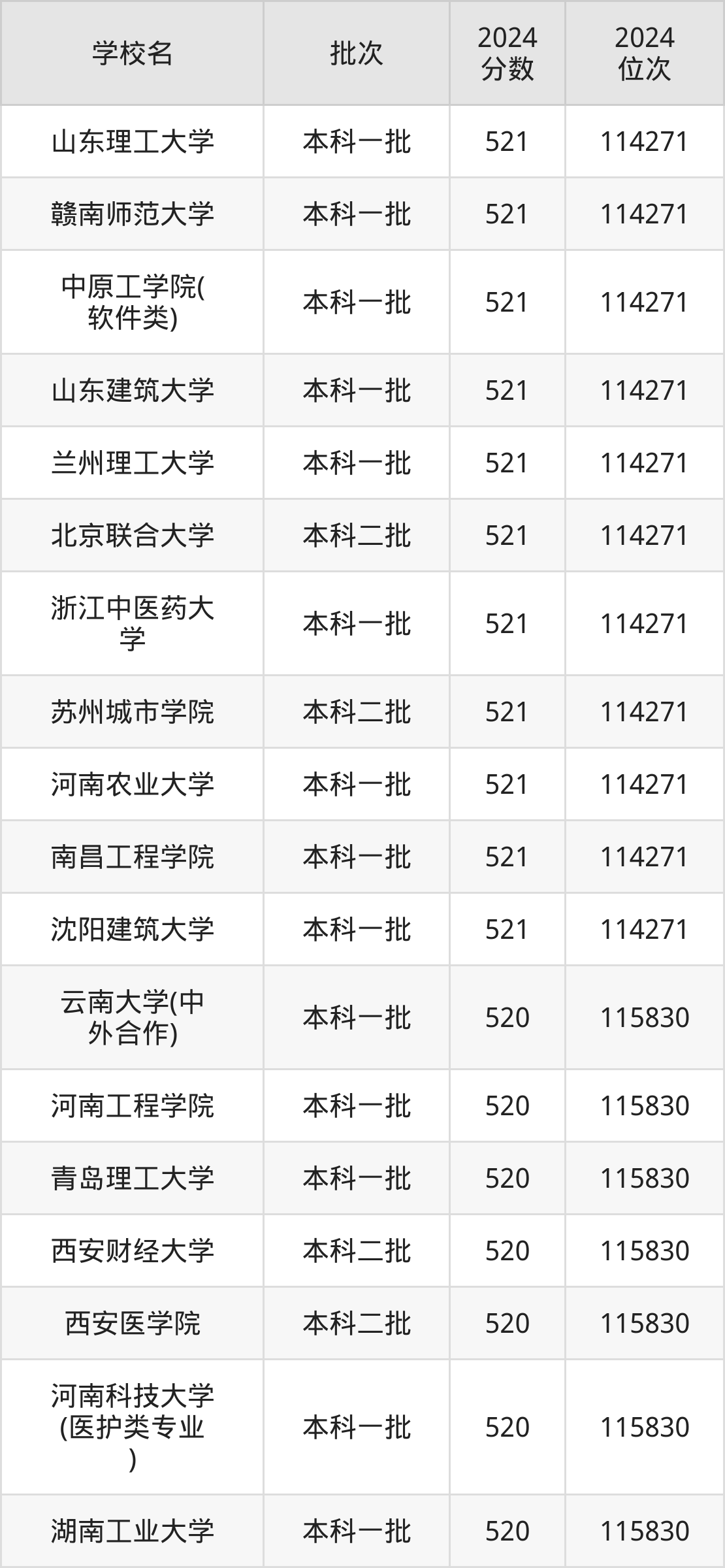 2024年河南高考理科520分(114272名~115830名)能上的大学有青岛理工大学、西安财经大学、湖南工业大学、西安医学院等。