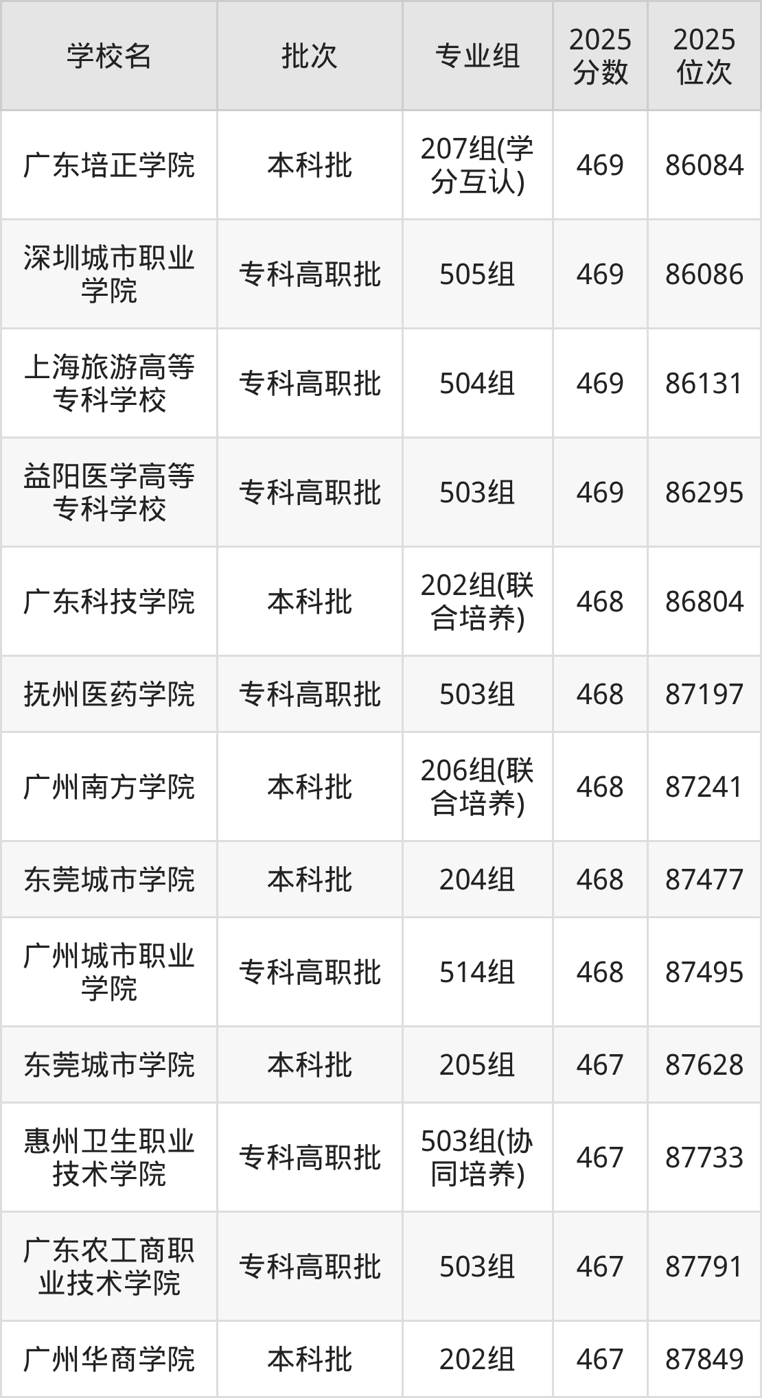 2025年广东高考历史类468分(86537名~87558名)能上的大学有广州南方学院206组(联合培养)、广东科技学院202组(联合培养)、东莞城市学院204组、抚州医药学院503组等。