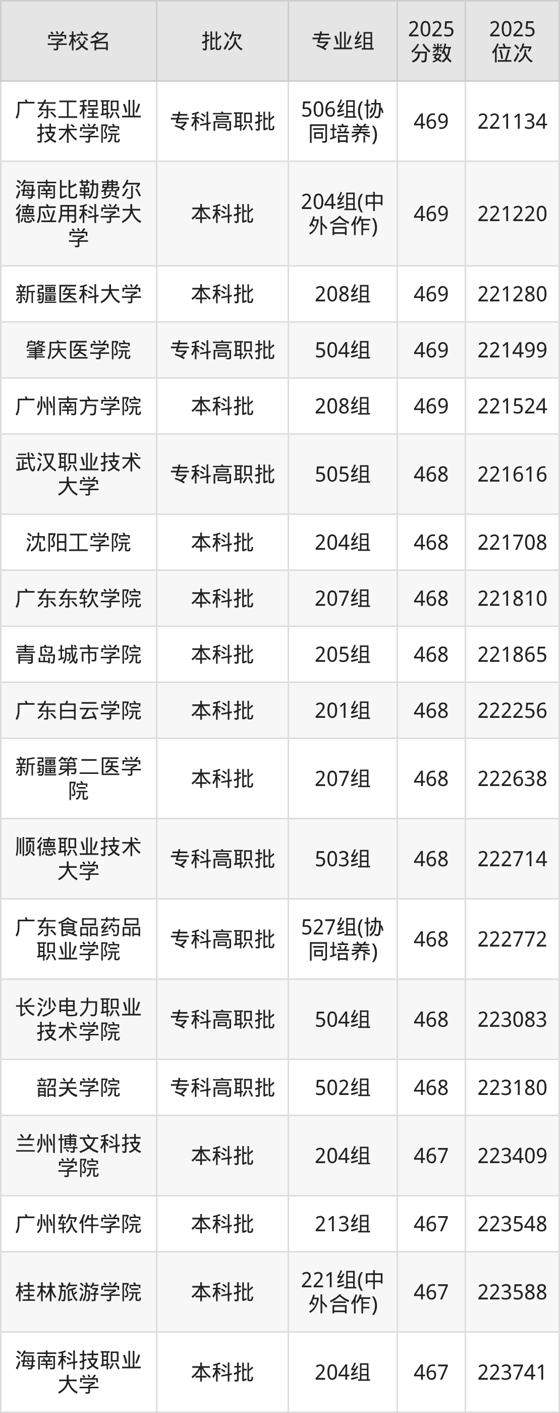 2025年广东高考物理类468分(221581名~223377名)能上的大学有广东白云学院201组、广东东软学院207组、沈阳工学院204组、青岛城市学院205组等。