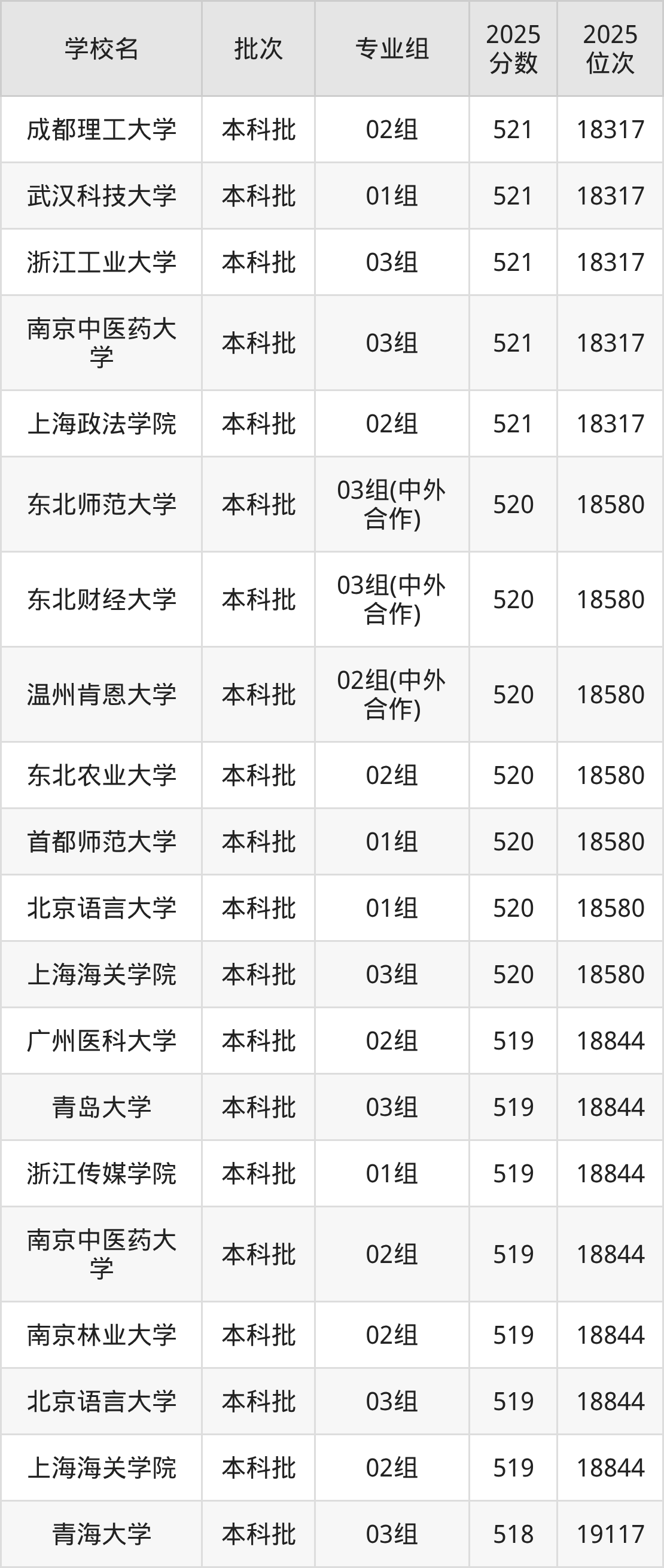 2025年上海高考519分(18581名~18844名)能上的大学有上海海关学院02组、北京语言大学03组、南京林业大学02组、南京中医药大学02组等。