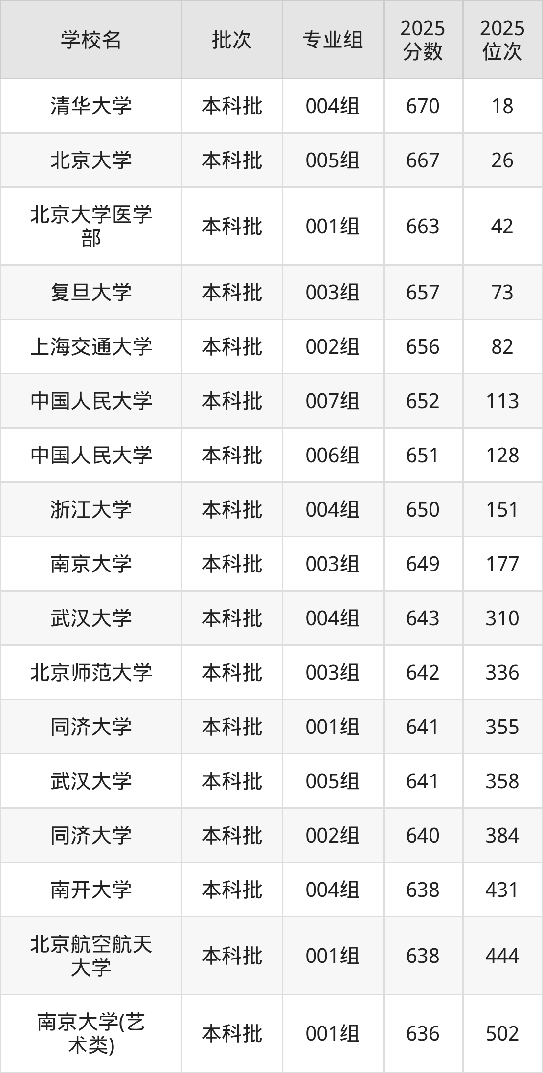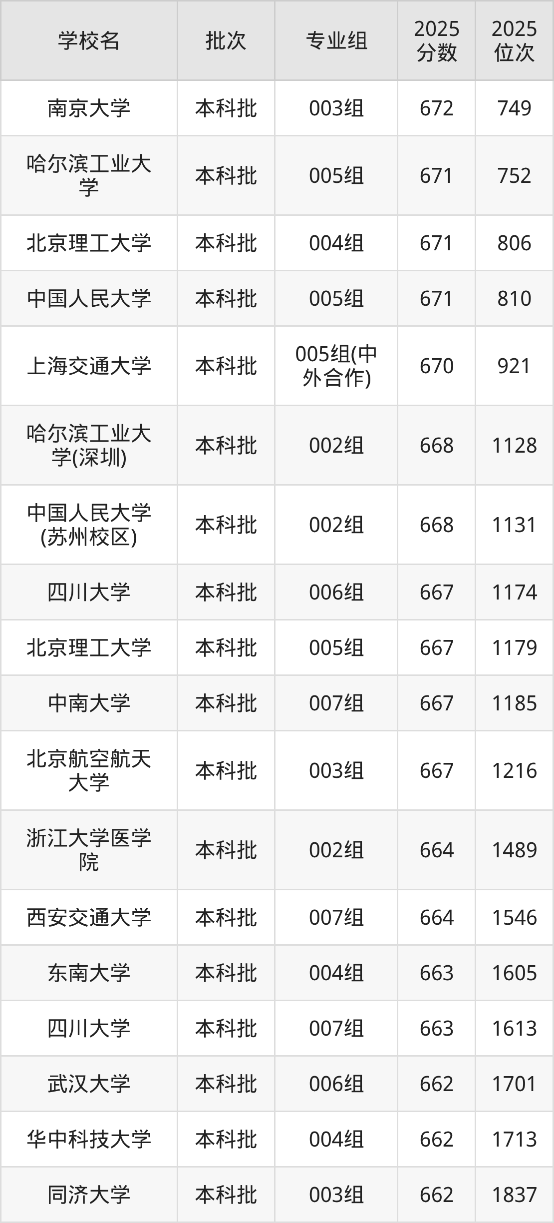 2025年安徽高考物理类666分(1227名~1340名)录取位次低于该区间(较稳妥)的有浙江大学医学院002组(1489名)、西安交通大学007组(1546名)等;录取位次高于该区间(可冲)的有北京航空航天大学003组(1216名)、中南大学007组(1185名)等。