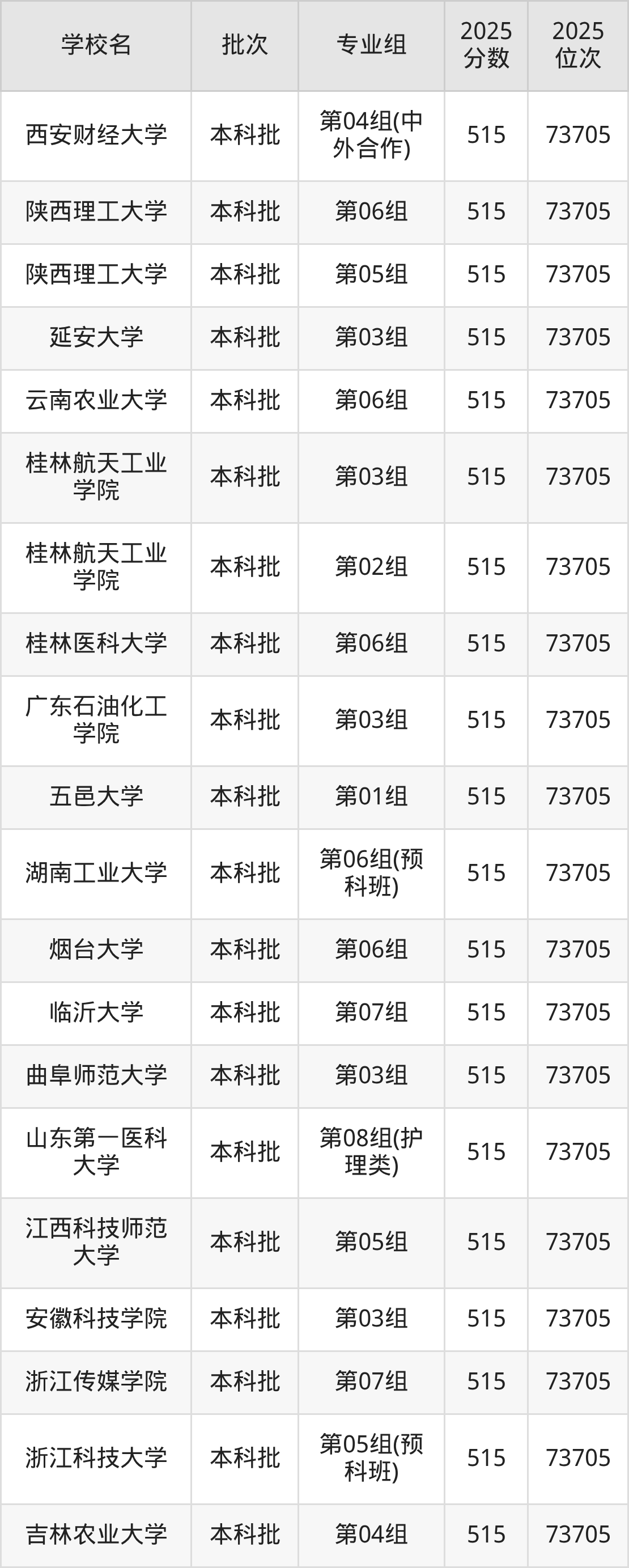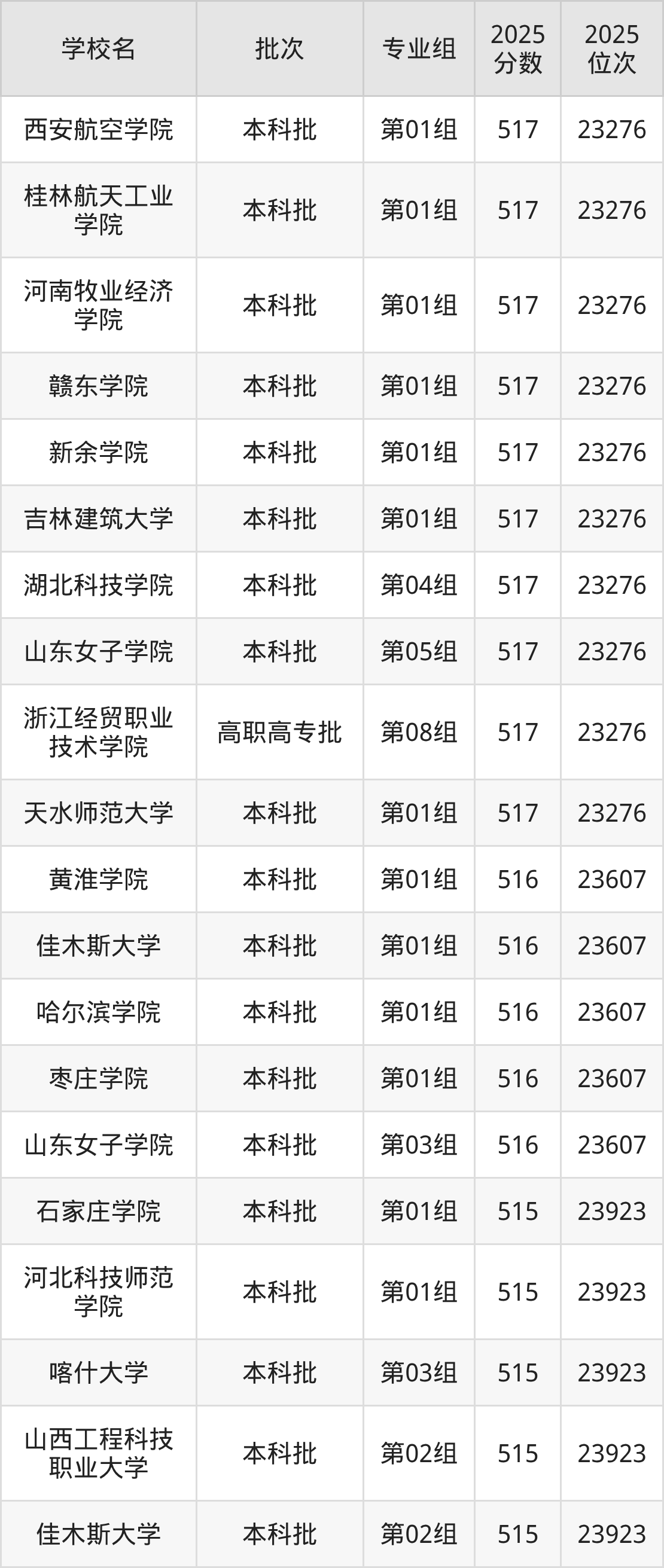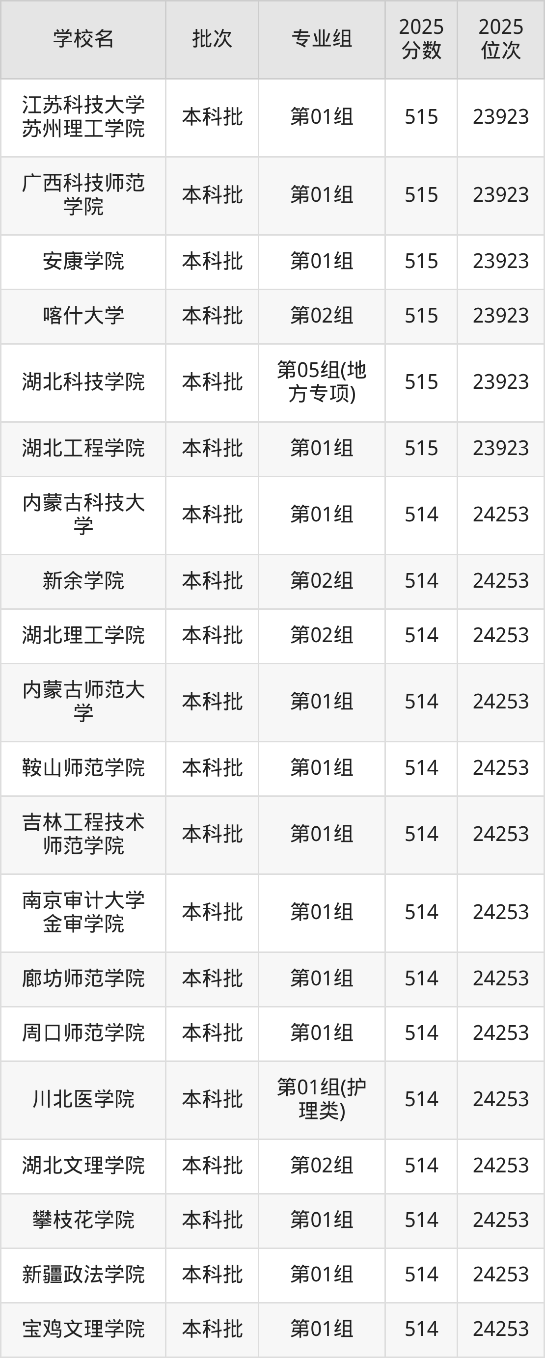 2025年湖北高考历史类515分(23608名~23923名)能上的大学有湖北科技学院第05组(地方专项)、湖北工程学院第01组、石家庄学院第01组、河北科技师范学院第01组等。