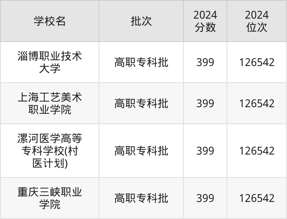 2024年河南高考文科399分(125471名~126542名)能上的大学有淄博职业技术大学、重庆三峡职业学院、上海工艺美术职业学院、漯河医学高等专科学校(村医计划)。
