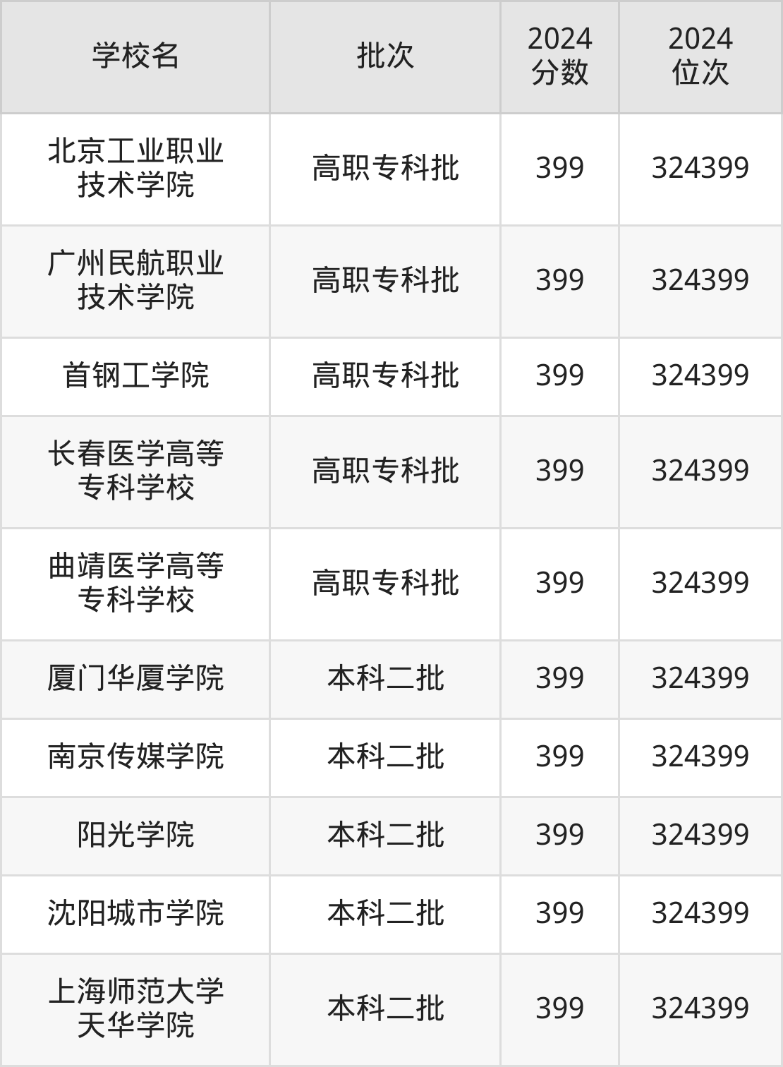 2024年河南高考理科399分(322651名~324400名)能上的大学有河南科技学院、南京传媒学院、上海师范大学天华学院、沈阳城市学院等。