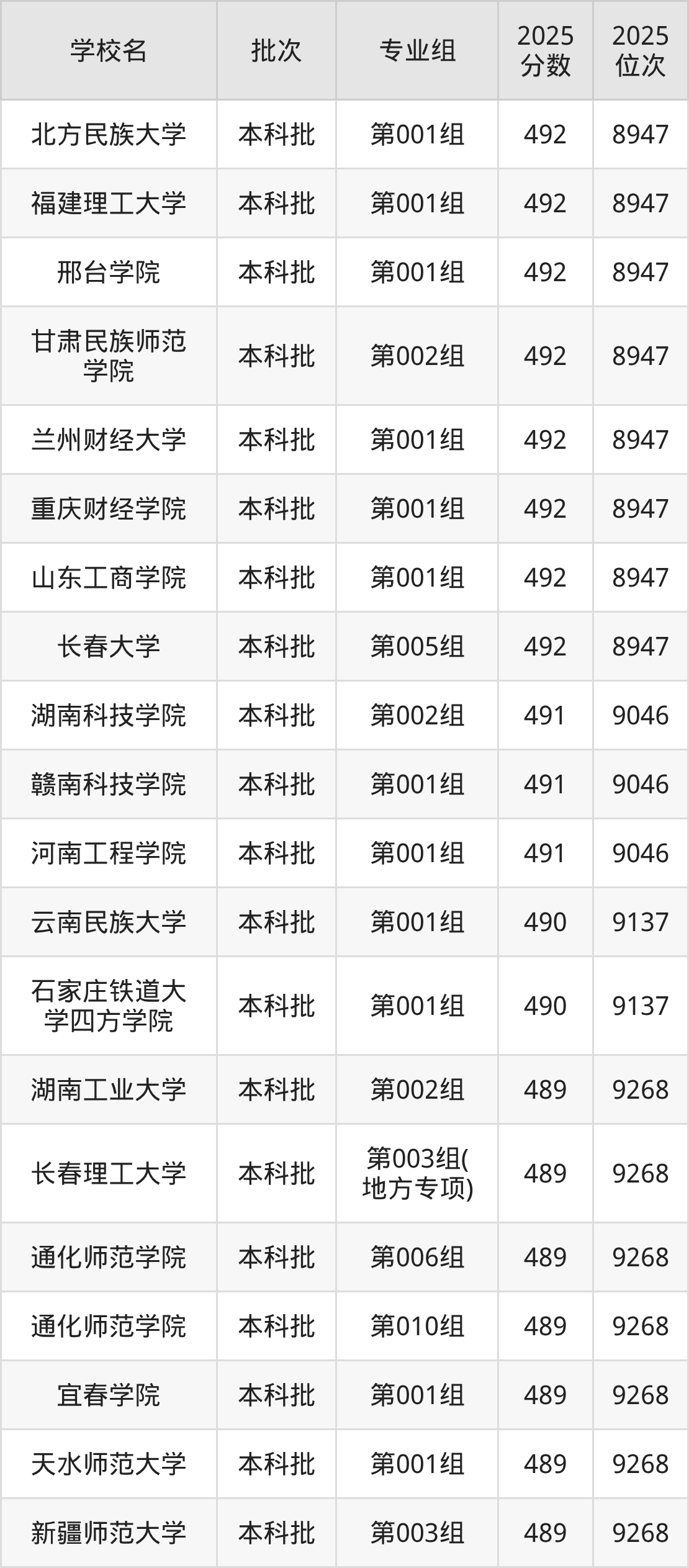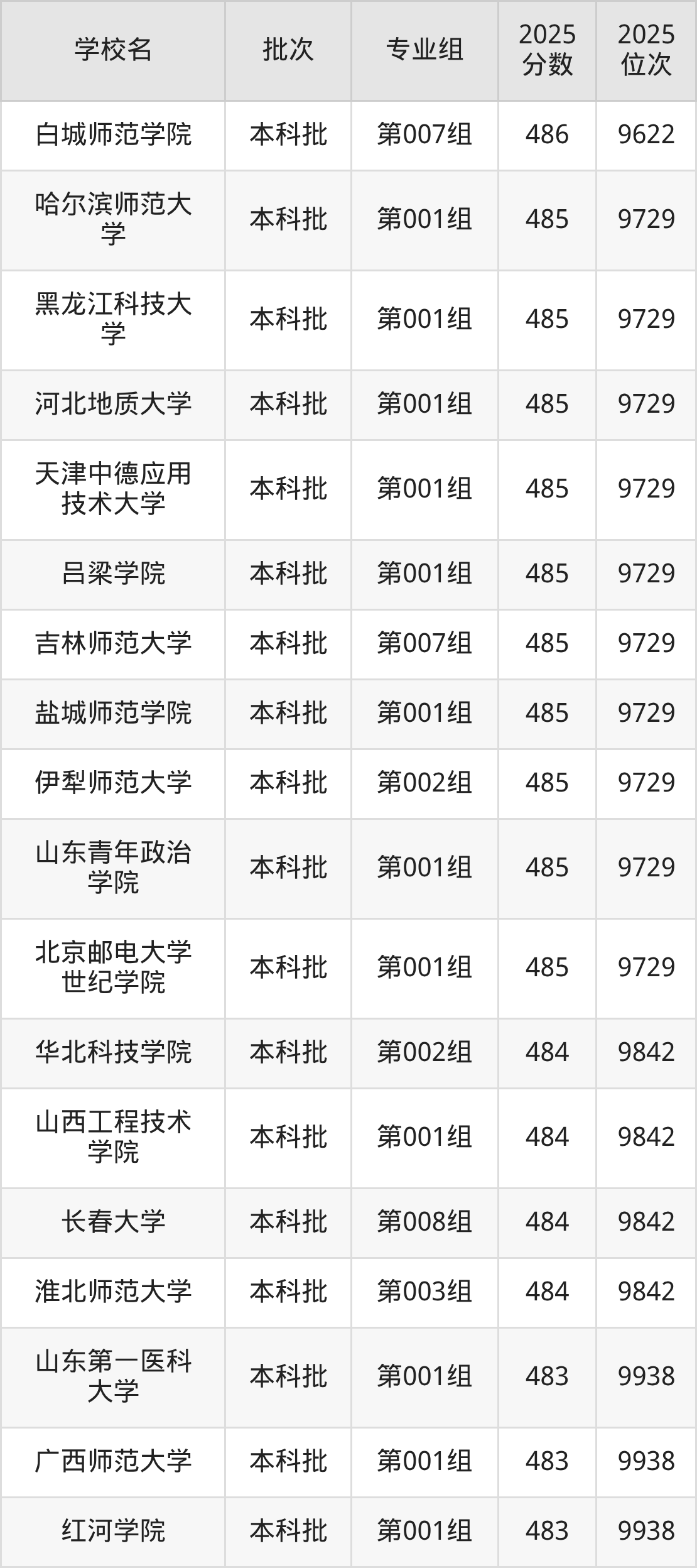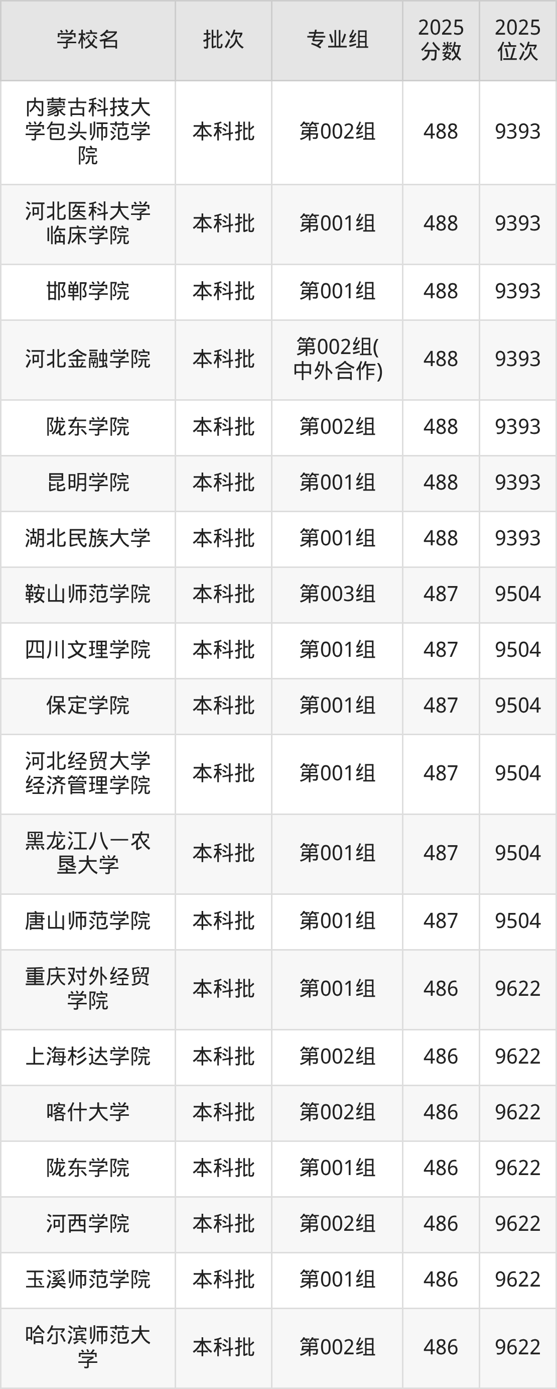 2025年吉林高考历史类487分(9394名~9504名)能上的大学有保定学院第001组、唐山师范学院第001组、河北经贸大学经济管理学院第001组、鞍山师范学院第003组等。