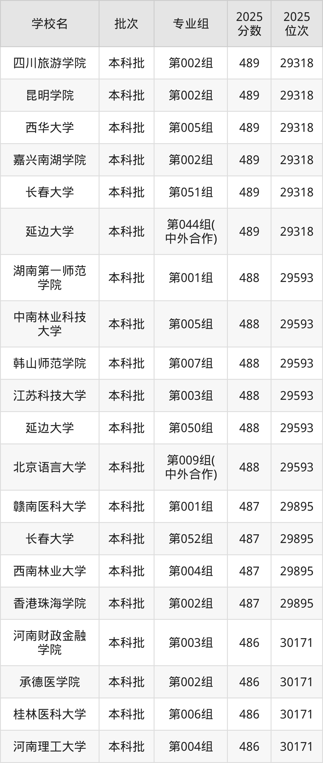 2025年吉林高考物理类487分(29594名~29895名)能上的大学有长春大学第052组、赣南医科大学第001组、西南林业大学第004组、香港珠海学院第002组。