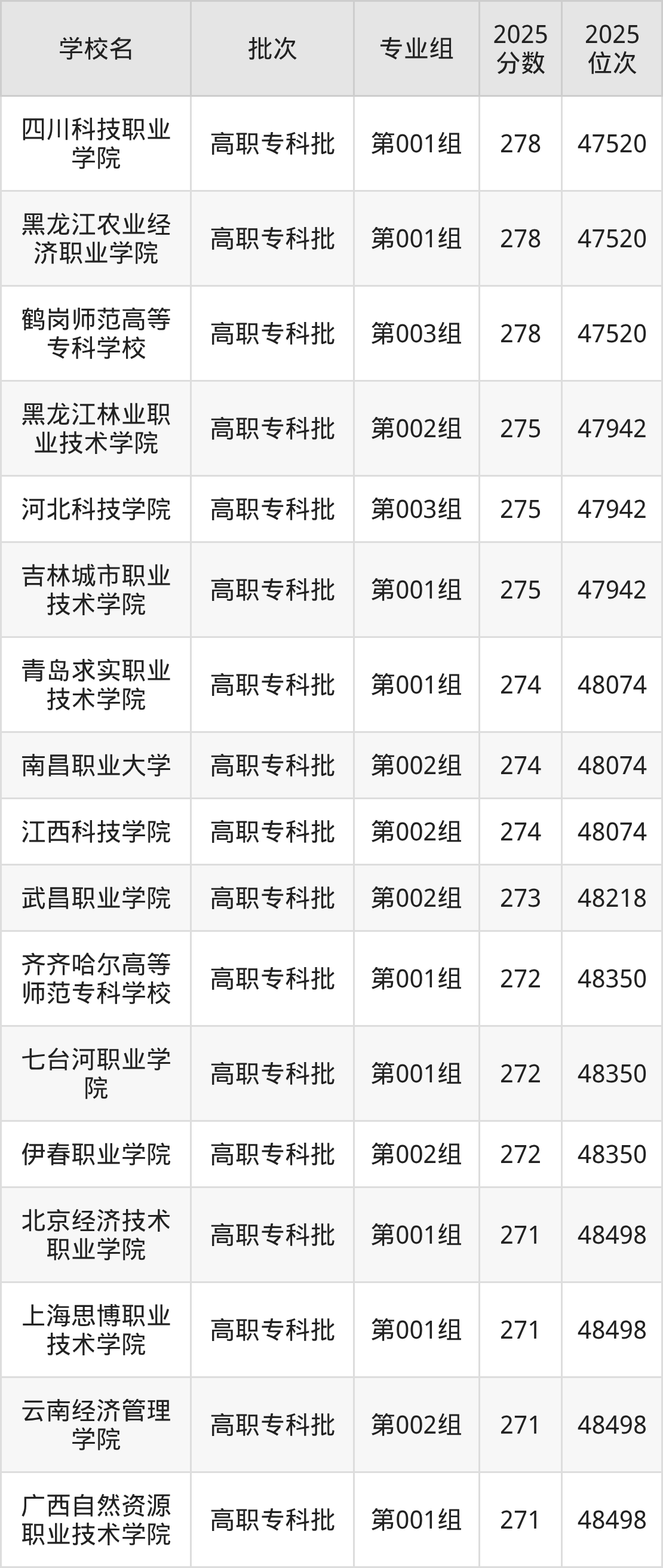 2025年黑龙江高考历史类274分(47943名~48074名)能上的大学有江西科技学院第002组、南昌职业大学第002组、青岛求实职业技术学院第001组。