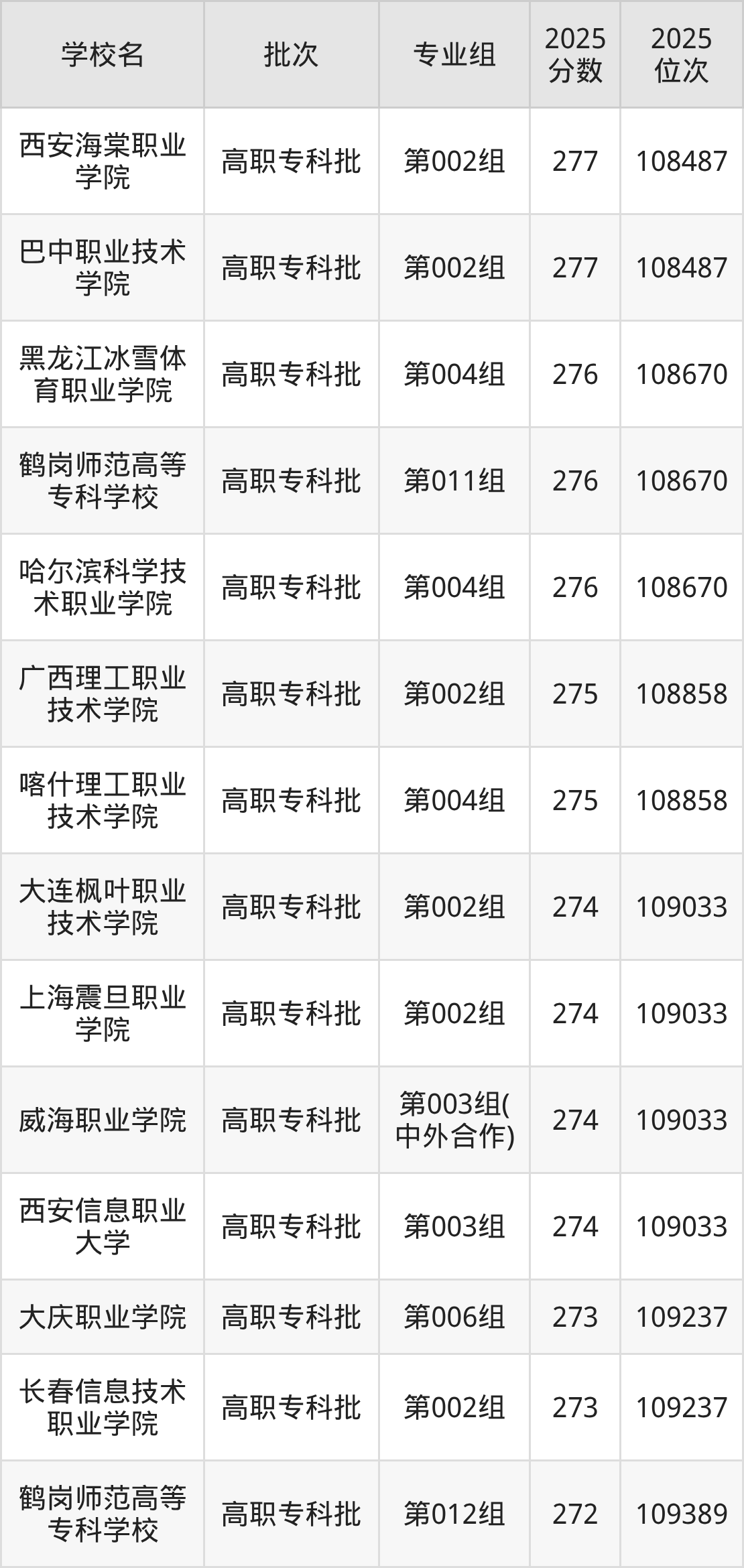 另外录取位次低于该区间(较稳妥)的有大庆职业学院第006组(109237名)、长春信息技术职业学院第002组(109237名)等;录取位次高于该区间(可冲)的有广西理工职业技术学院第002组(108858名)、喀什理工职业技术学院第004组(108858名)等。