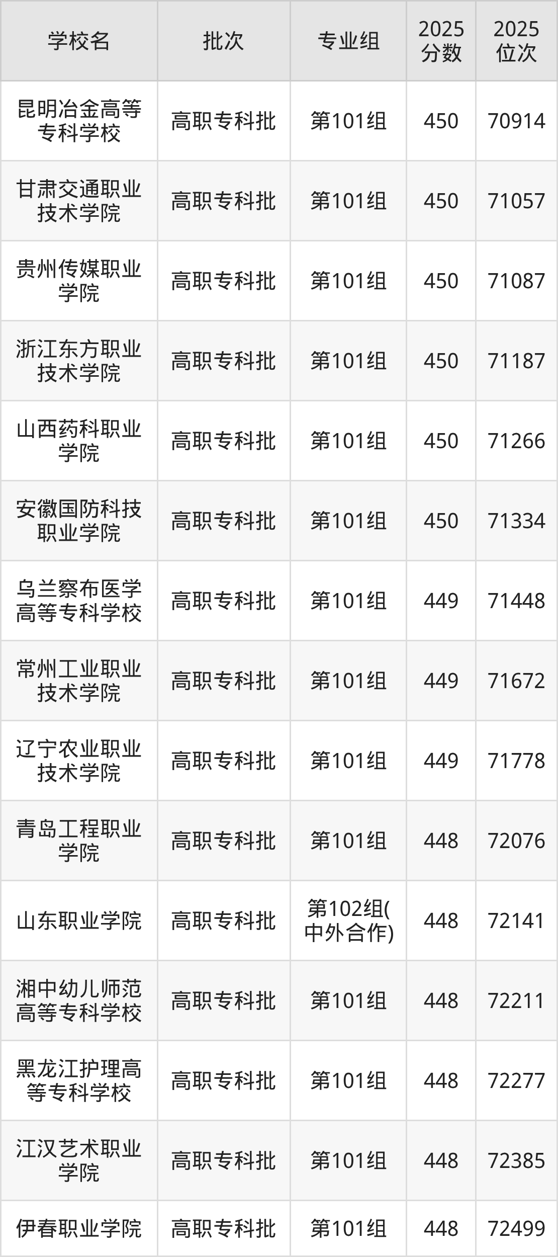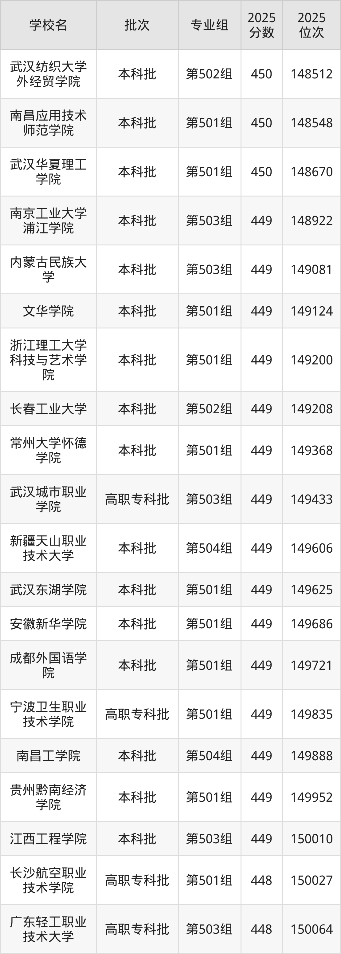 2025年江西高考历史类449分(71382名~72030名)能上的大学有辽宁农业职业技术学院第101组、常州工业职业技术学院第101组、乌兰察布医学高等专科学校第101组。