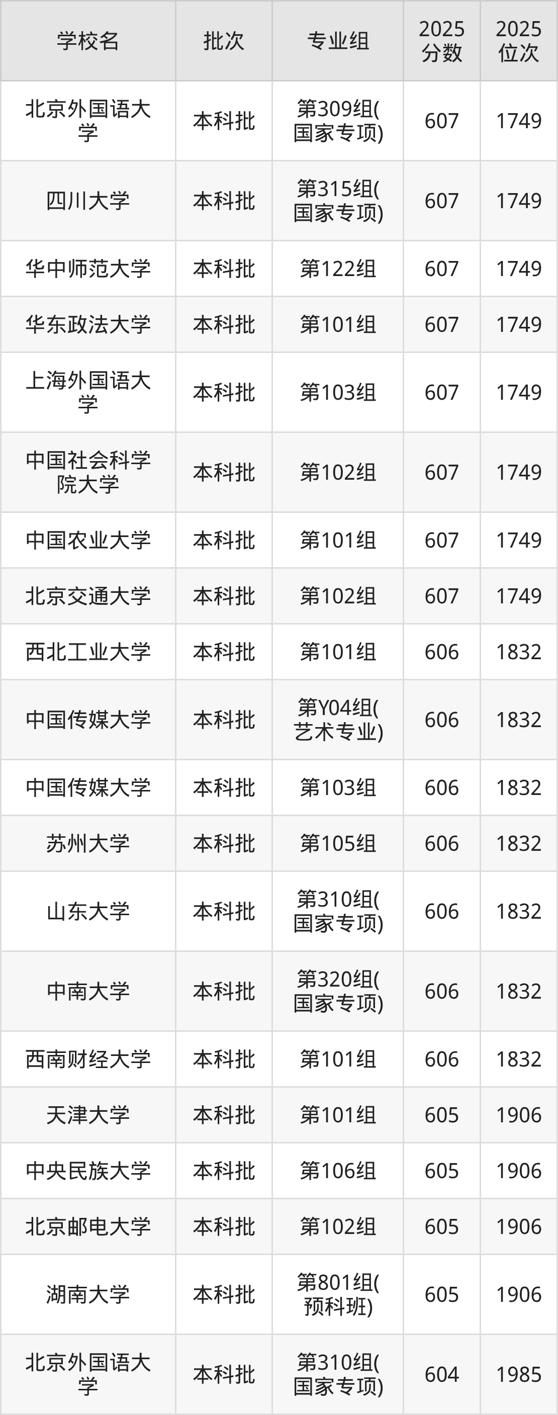 湖南高考601分:历史类排名2273位、物理类排名15422位。该分数位次对应能上的大学历史类有北京科技大学第102组、天津大学第303组(国家专项);物理类有北京交通大学第209组(中外合作)、北京林业大学第108组,更多名单如下文所示,2026届考生可参考。