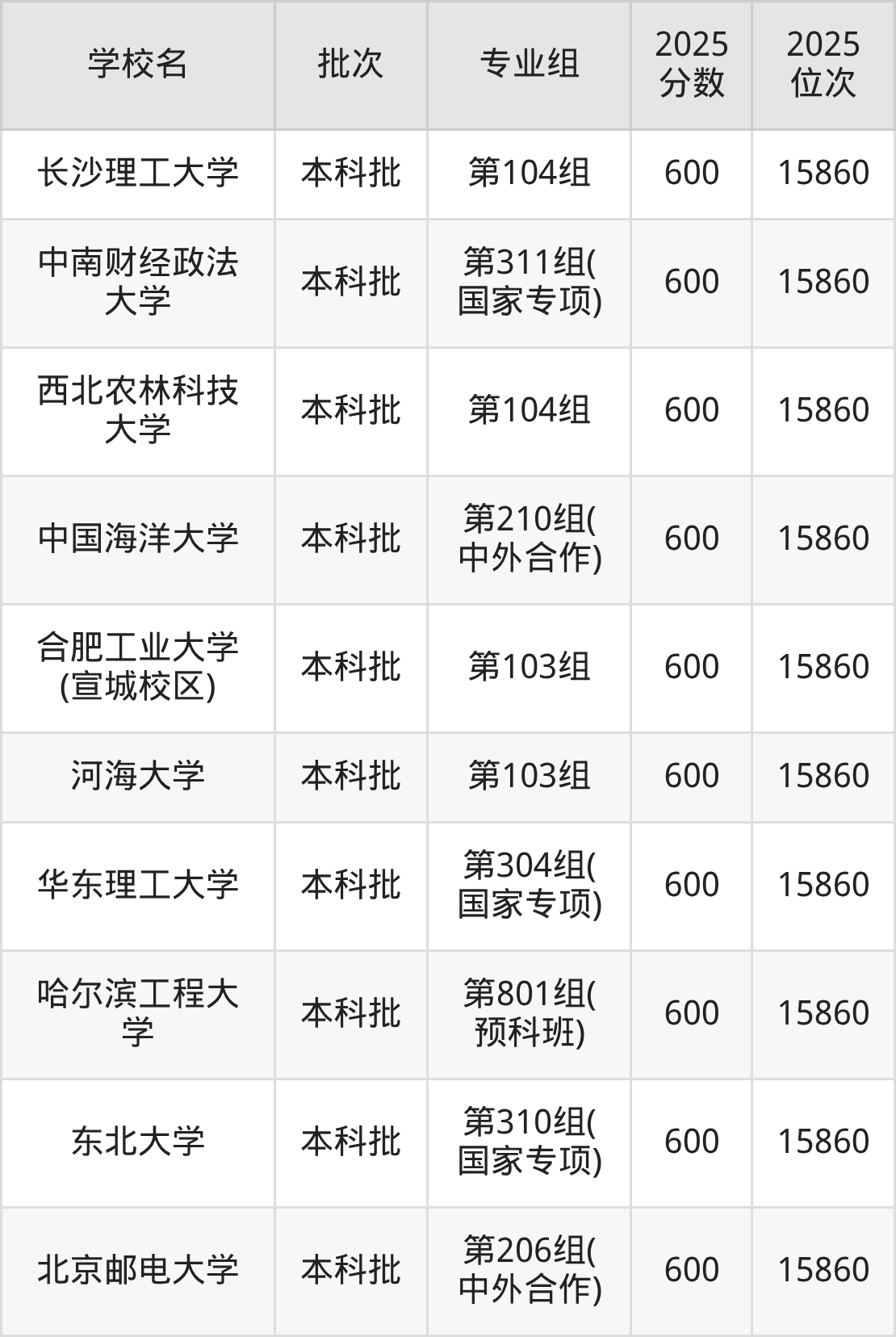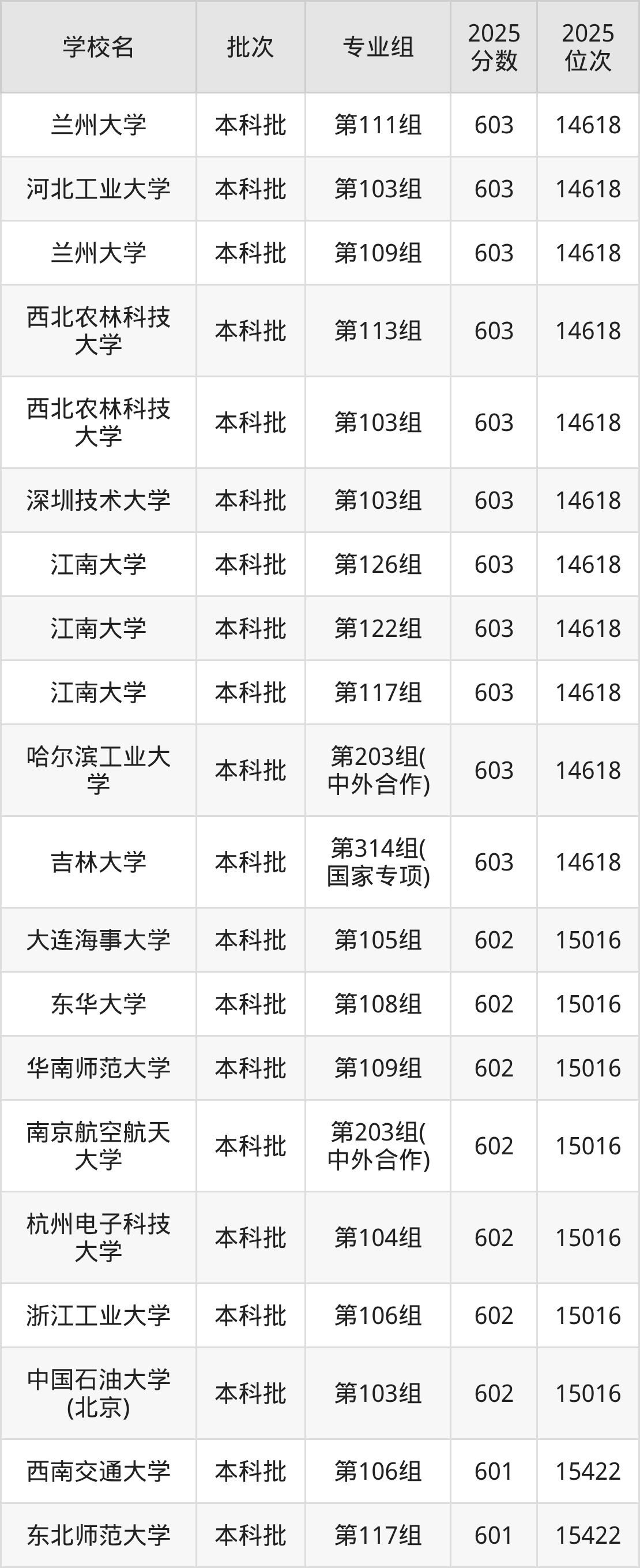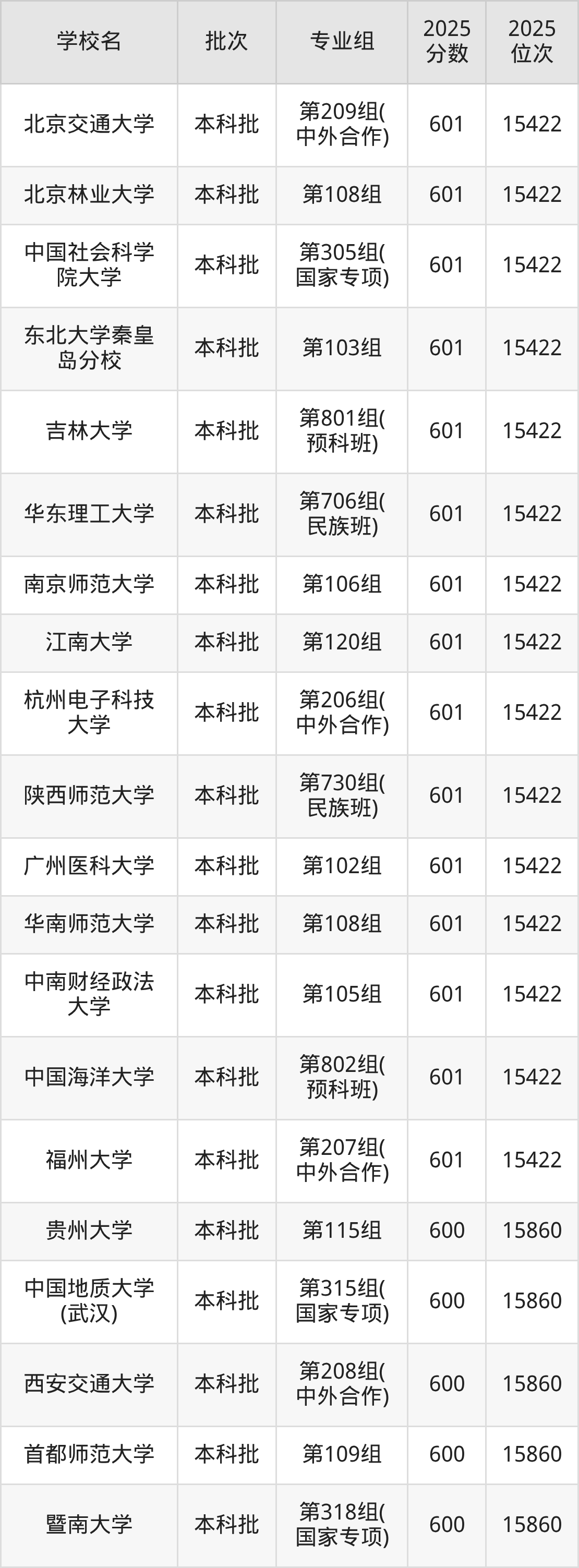 2025年湖南高考物理类601分(15017名~15422名)能上的大学有北京交通大学第209组(中外合作)、北京林业大学第108组、中国社会科学院大学第305组(国家专项)、东北大学秦皇岛分校第103组等。