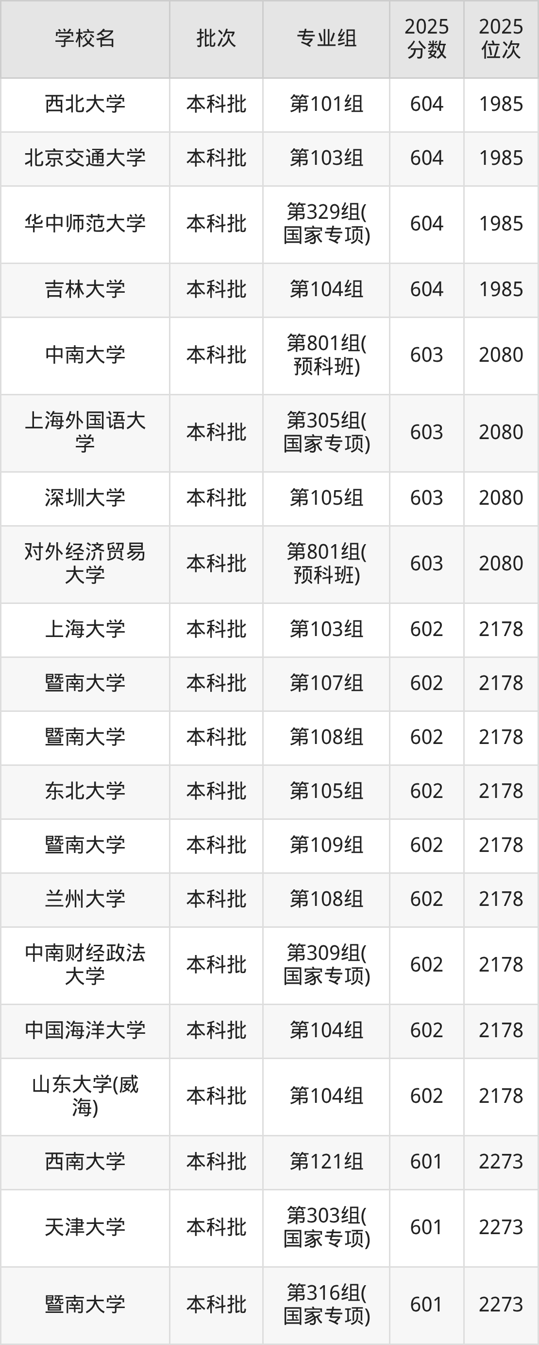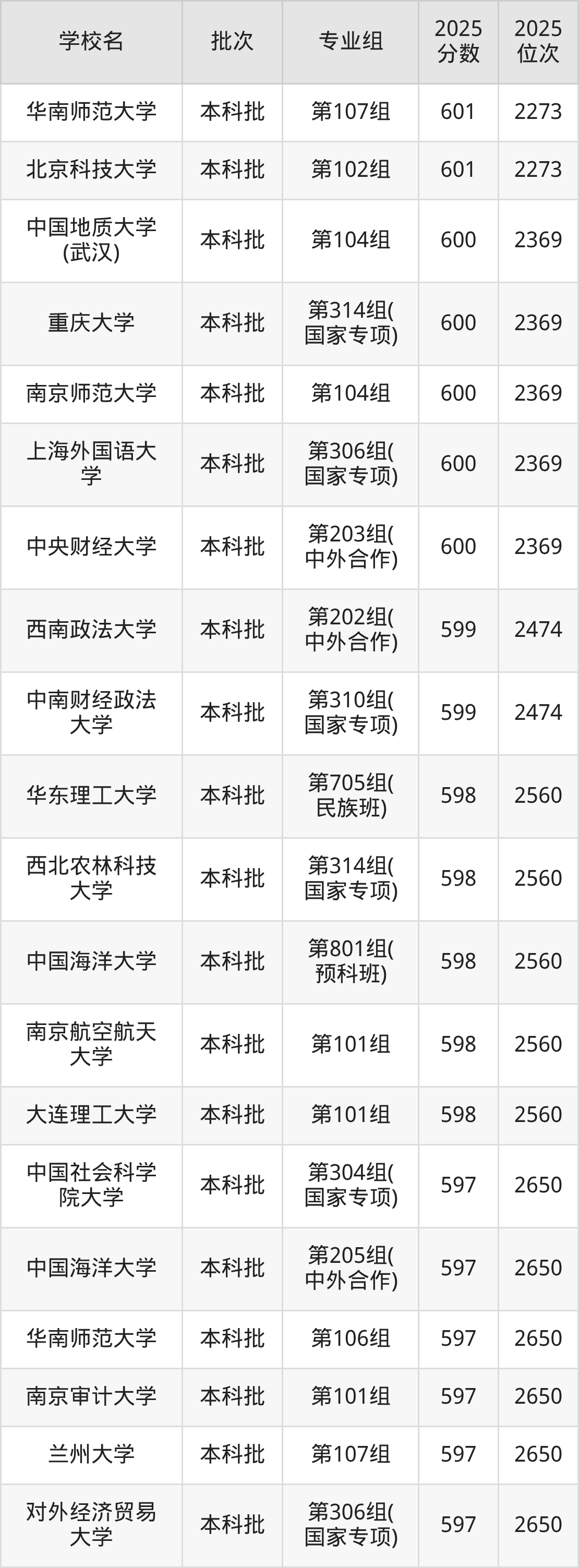 2025年湖南高考历史类601分(2179名~2273名)能上的大学有北京科技大学第102组、天津大学第303组(国家专项)、暨南大学第316组(国家专项)、华南师范大学第107组等。