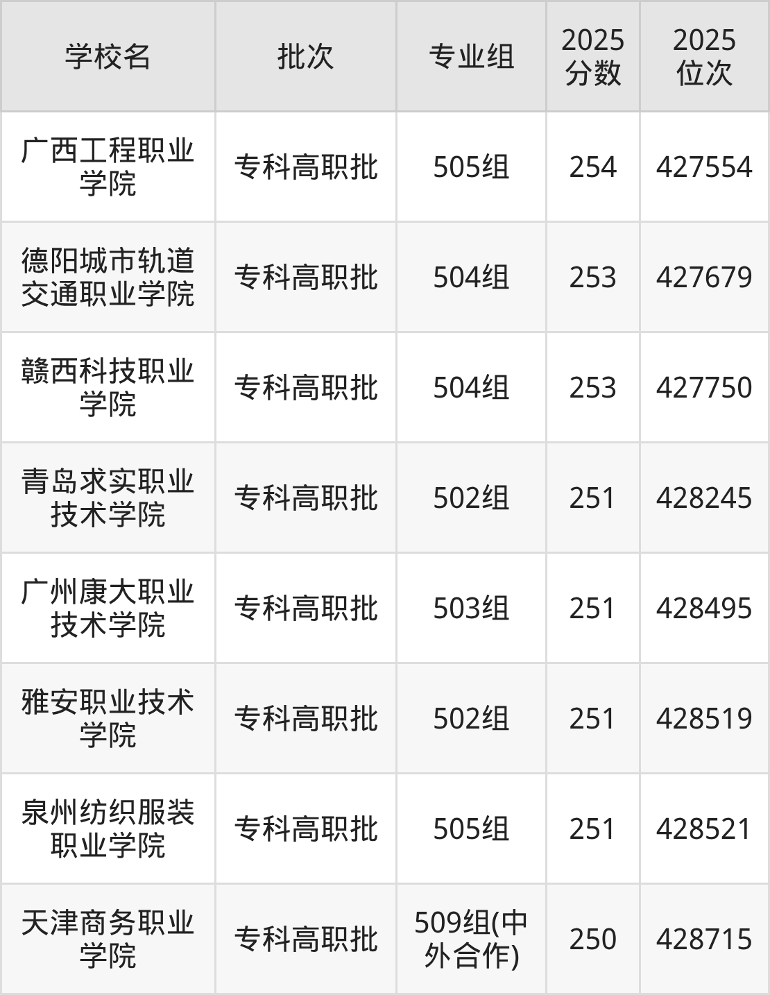 2025年广东高考物理类252分(427942名~428237名)录取位次低于该区间(较稳妥)的有青岛求实职业技术学院502组(428245名)、广州康大职业技术学院503组(428495名)等;录取位次高于该区间(可冲)的有赣西科技职业学院504组(427750名)、德阳城市轨道交通职业学院504组(427679名)等。
