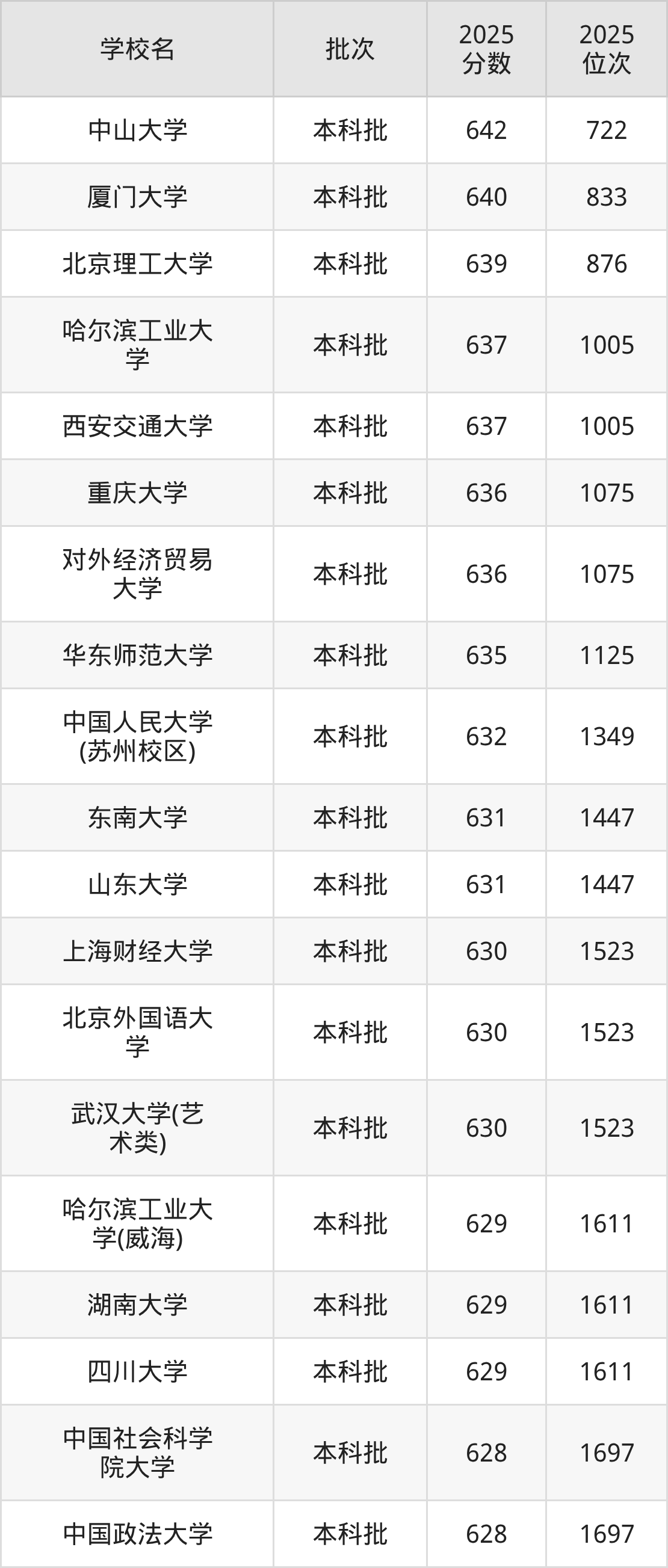 由于高考录取分数线历年波动较大,因此本文以该分数对应的位次排名为大家整理能上的大学名单。
