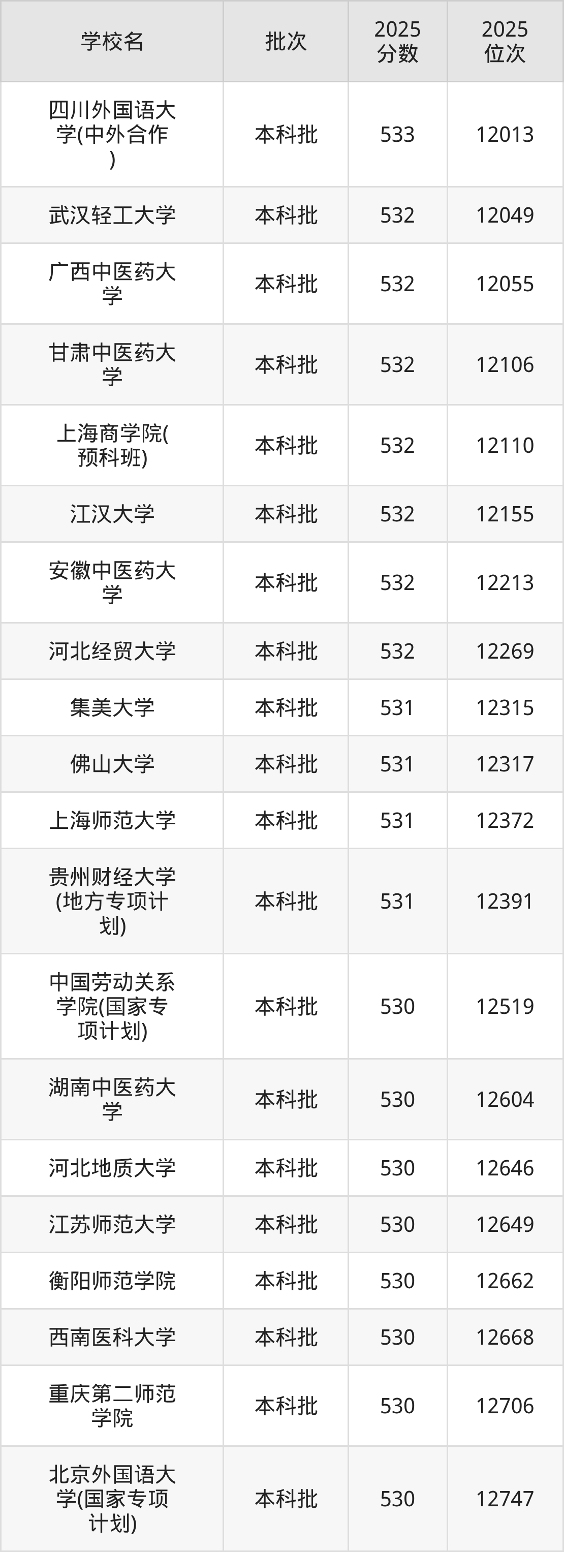 2025年贵州高考历史类530分(12501名~12768名)能上的大学有北京外国语大学(国家专项计划)、中国劳动关系学院(国家专项计划)、湖南中医药大学、重庆第二师范学院等。