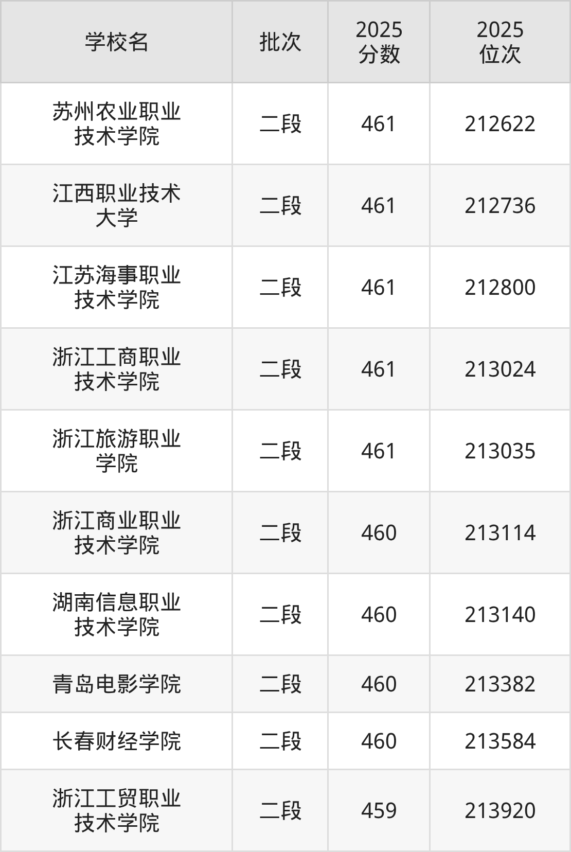 2025年浙江高考460分(213064名~213914名)能上的大学有湖南信息职业技术学院、青岛电影学院、浙江商业职业技术学院、长春财经学院。