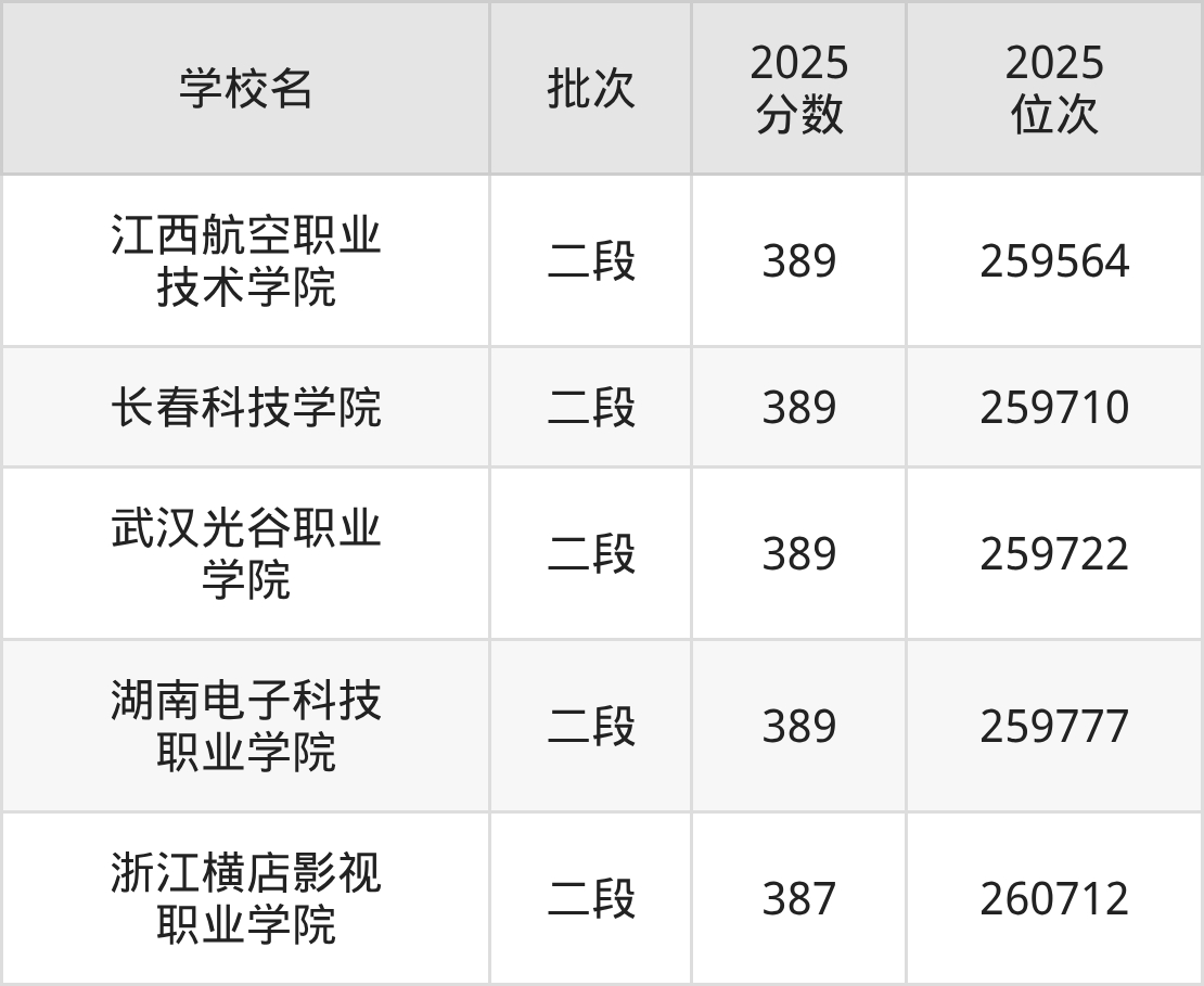 2025年浙江高考388分(259979名~260443名)录取位次低于该区间(较稳妥)的有浙江横店影视职业学院(260712名)、兰州石化职业技术大学(261119名)等;录取位次高于该区间(可冲)的有湖南电子科技职业学院(259777名)、武汉光谷职业学院(259722名)等。