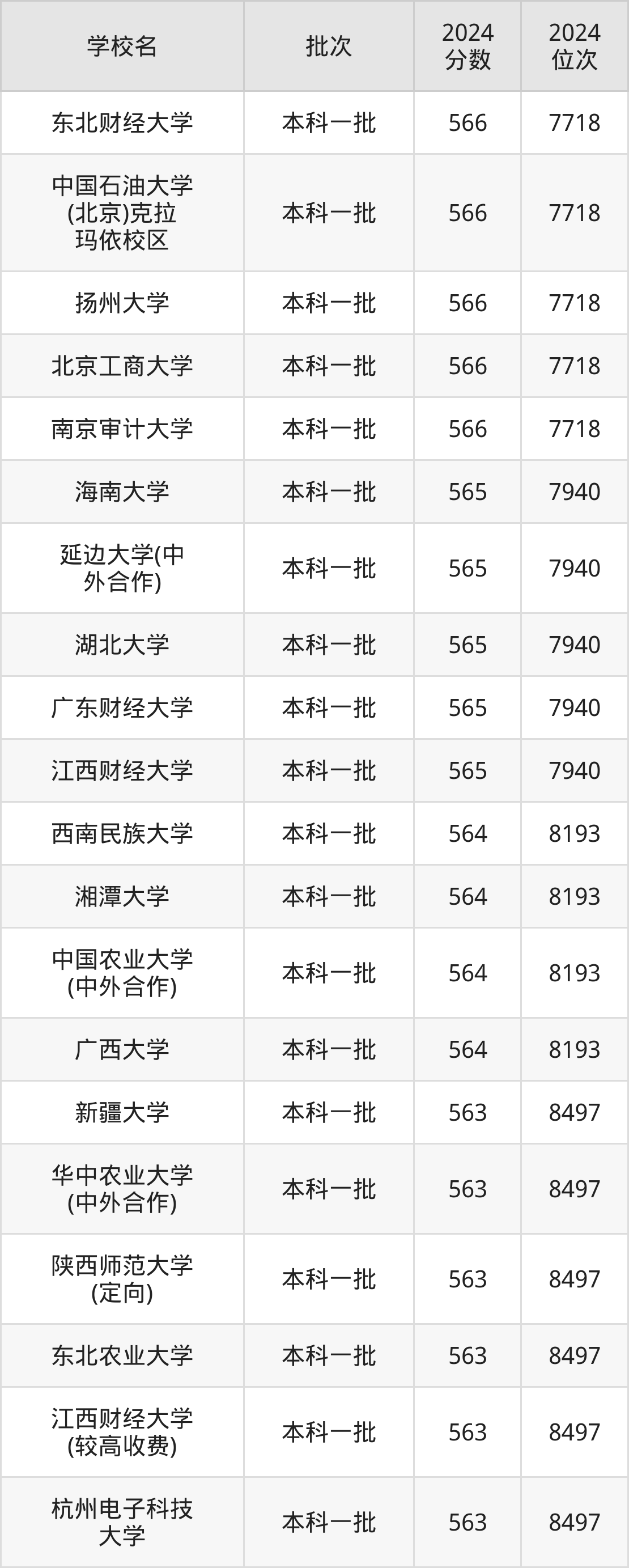 2024年河南高考文科563分(8194名~8497名)能上的大学有杭州电子科技大学、东北农业大学、新疆大学、华中农业大学(中外合作)等。