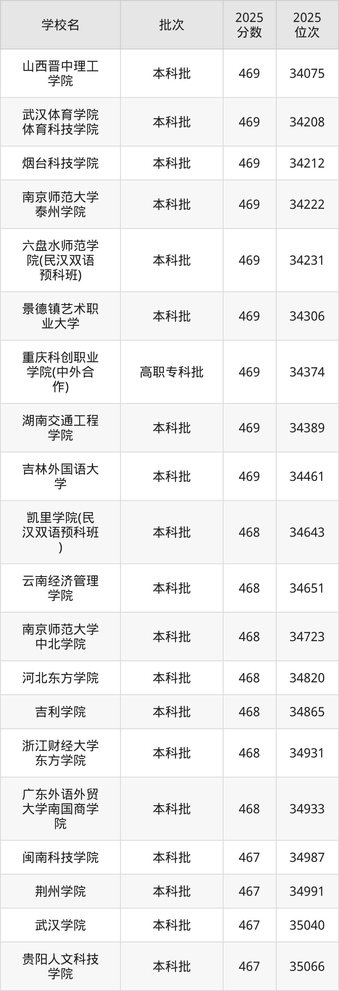 2025年贵州高考历史类468分(34504名~34933名)能上的大学有广东外语外贸大学南国商学院、吉利学院、云南经济管理学院、河北东方学院等。