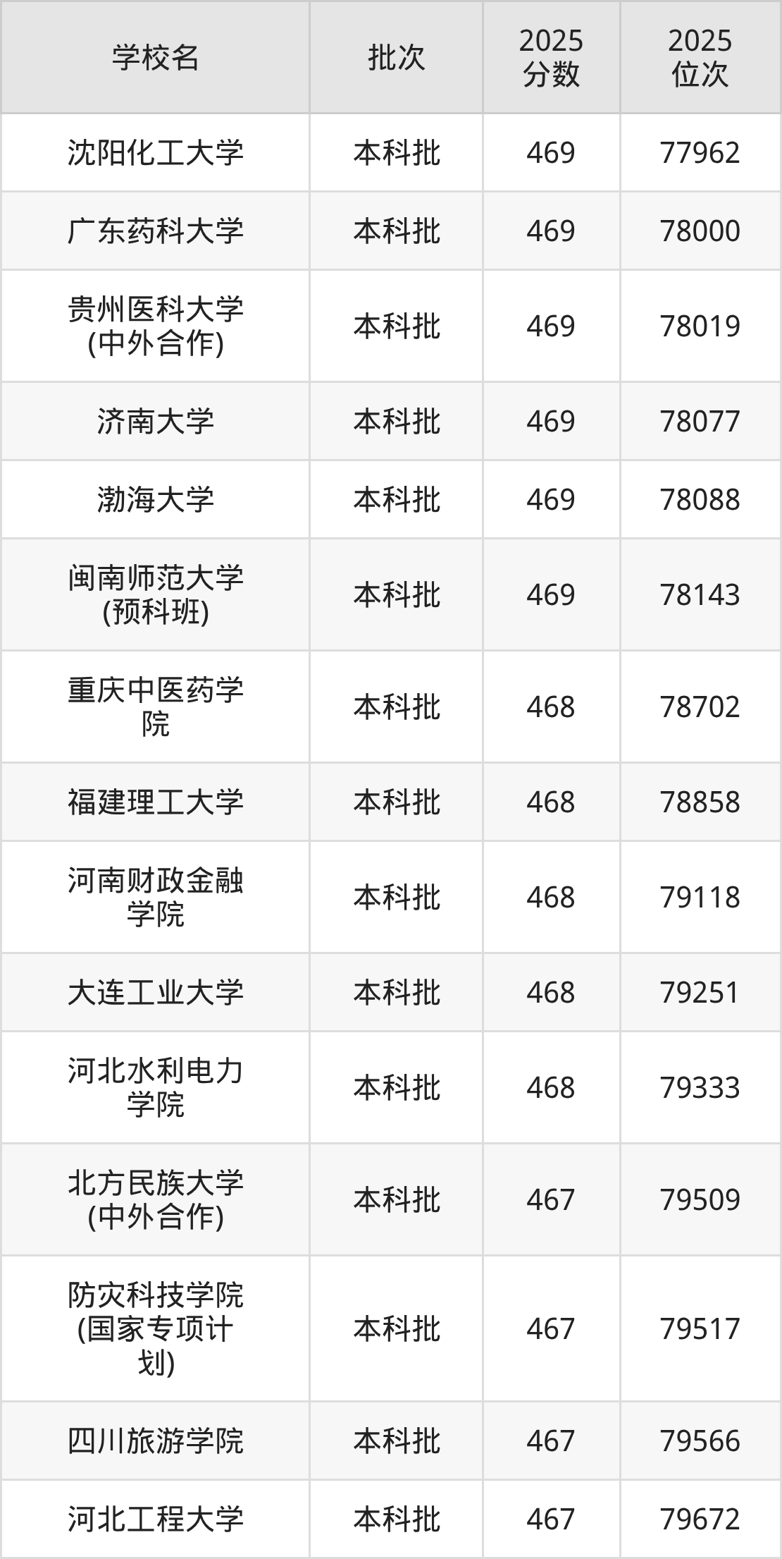 2025年贵州高考物理类468分(78452名~79424名)能上的大学有河南财政金融学院、河北水利电力学院、福建理工大学、大连工业大学等。