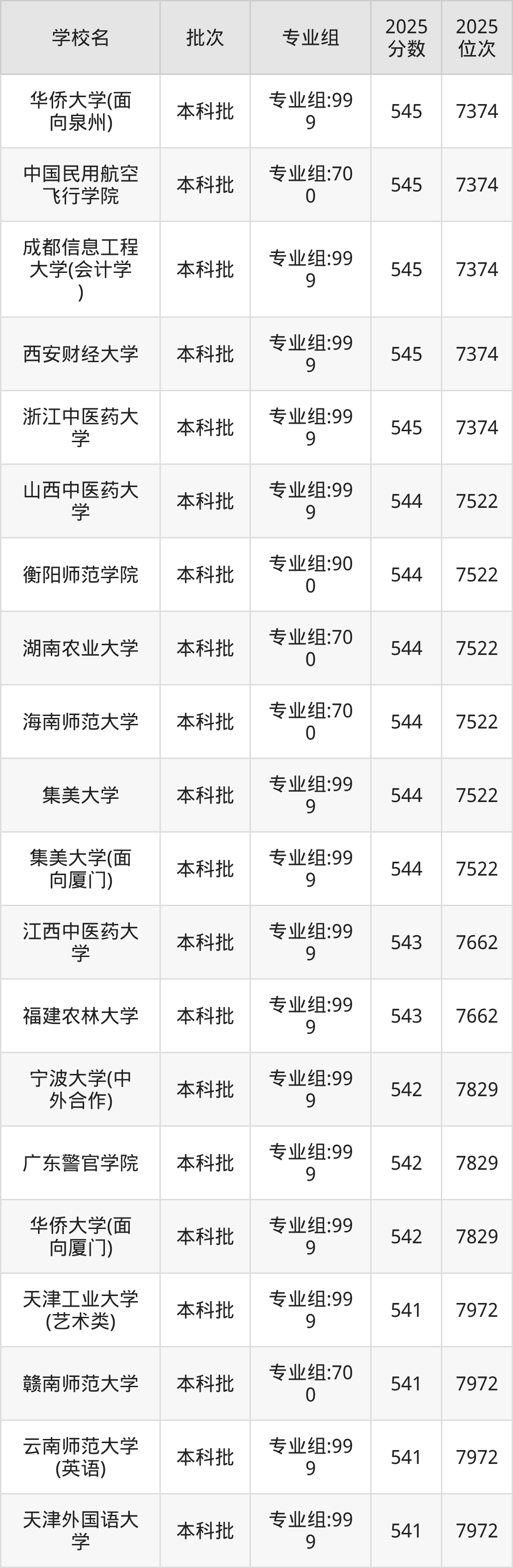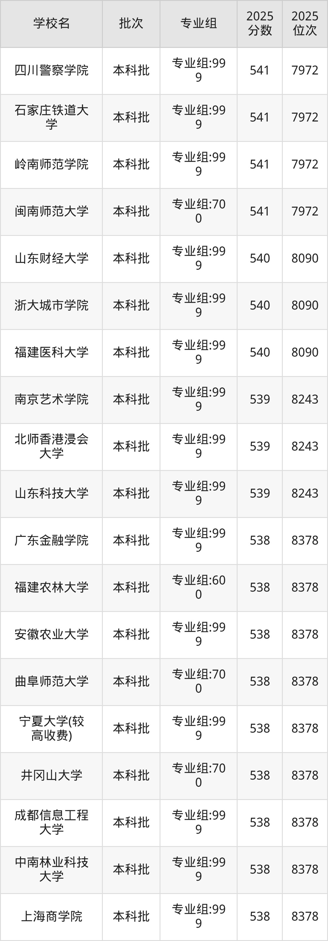 2025年福建高考历史类541分(7830名~7972名)能上的大学有闽南师范大学专业组:700、赣南师范大学专业组:700、岭南师范学院专业组:999、石家庄铁道大学专业组:999等。