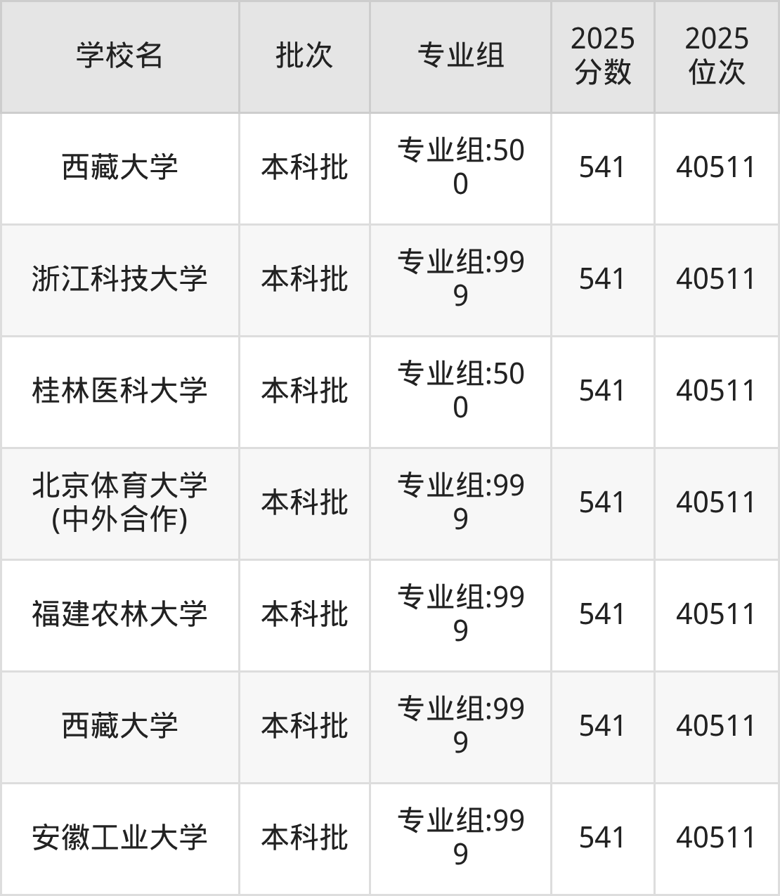 2025年福建高考物理类541分(39898名~40511名)能上的大学有福建农林大学专业组:999、福建农林大学(闽台合作办学)专业组:999、安徽工业大学专业组:999、北京体育大学(中外合作)专业组:999等。